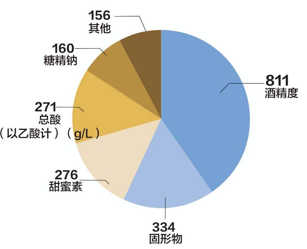 在这其中,固形物含量的超标达到了334批次,占比为16.63%。什么是固形物呢?就是白酒在经过蒸发和干燥后,残留下来的没有挥发性的物质,而这些物质主要是由于酒类储存的容器和添加剂以及香料、浆水带来的。
