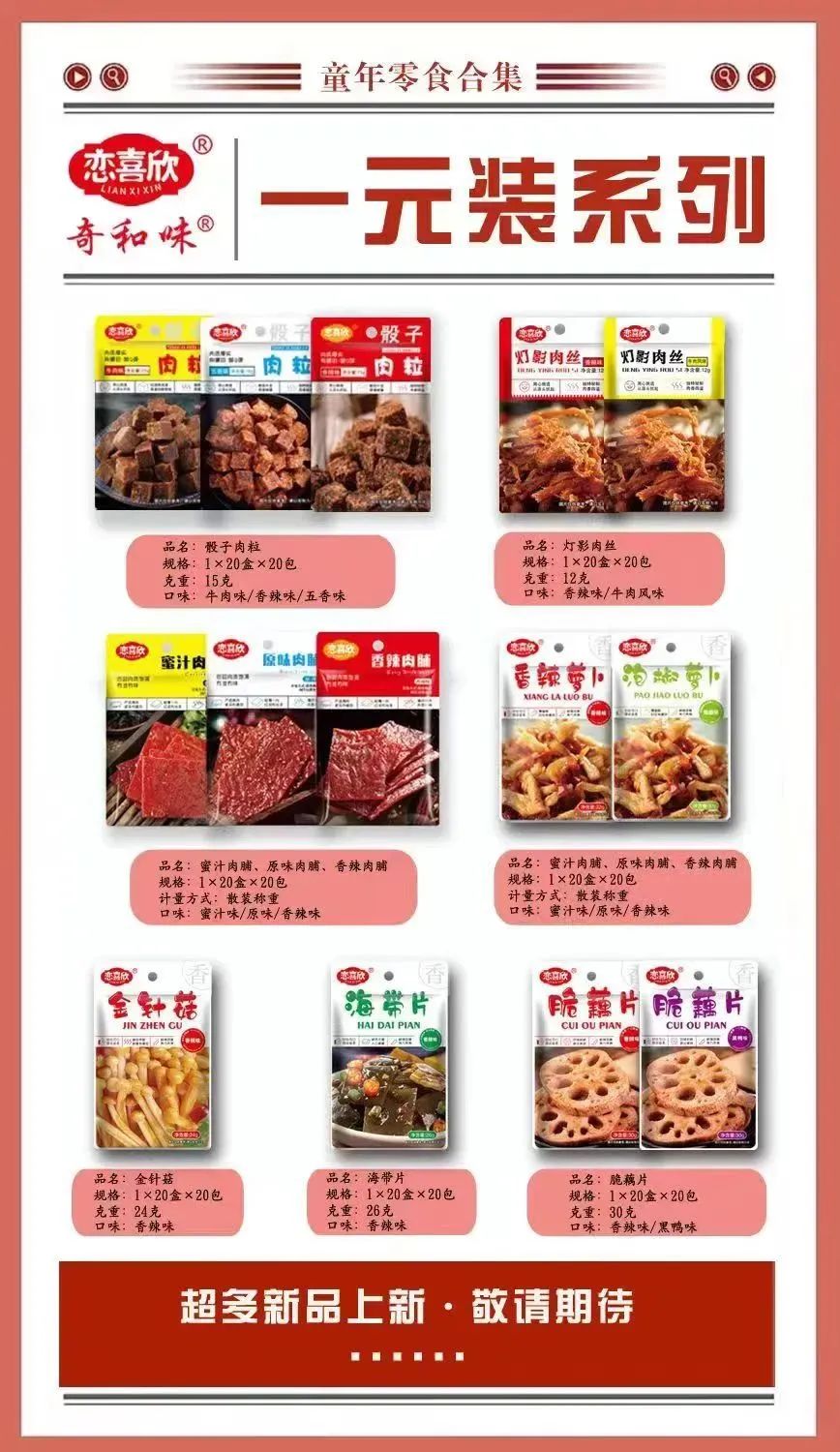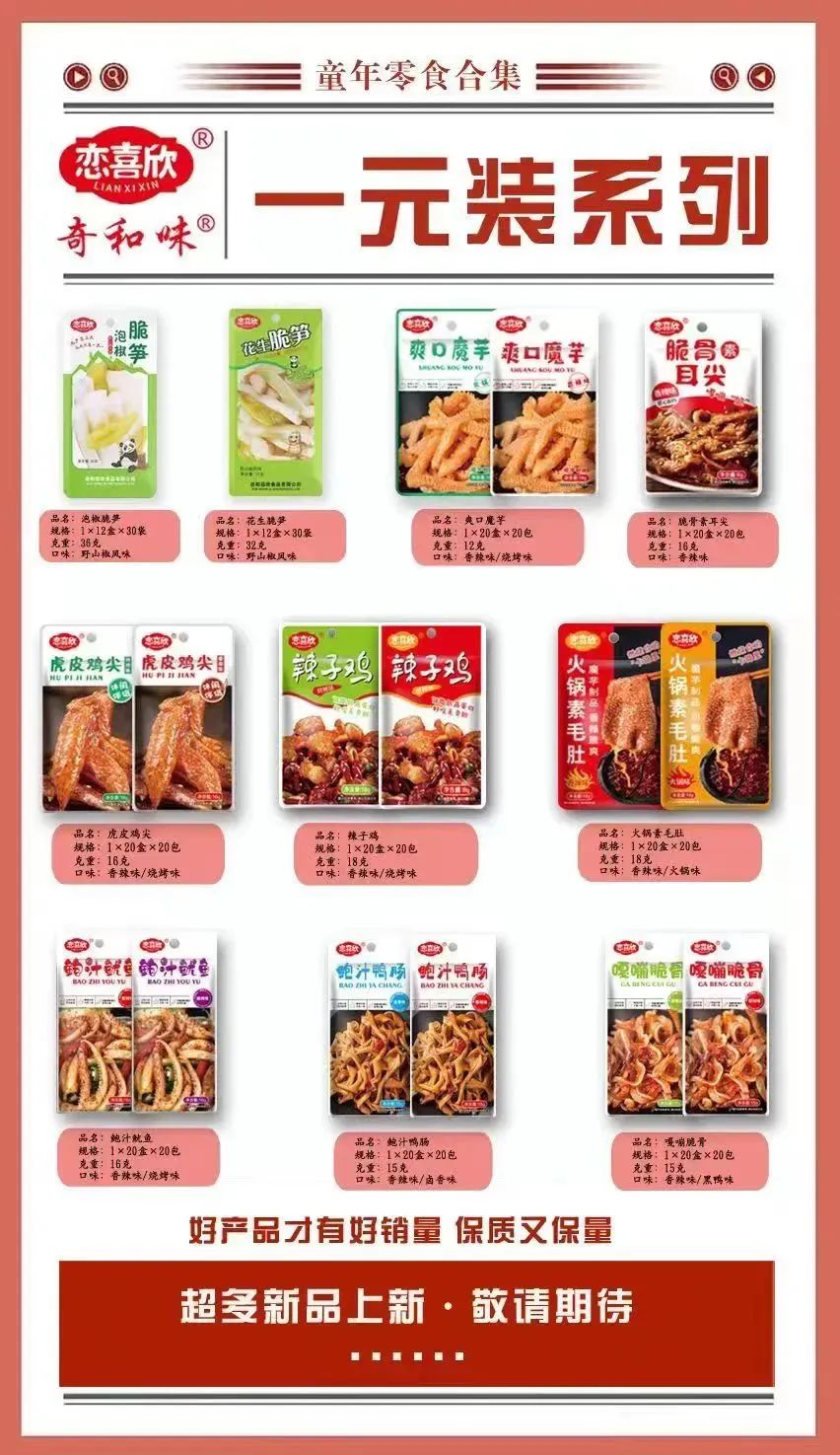 产品介绍:两元辣条,烤腿,烤脖,卤鸭翅,鸭锁骨 烤蛋!一元 脆笋,肉脯干,毛肚,脆骨,鱿鱼,鸭肠,虎皮鸡尖,魔芋,海带,藕片,金针菇,萝卜