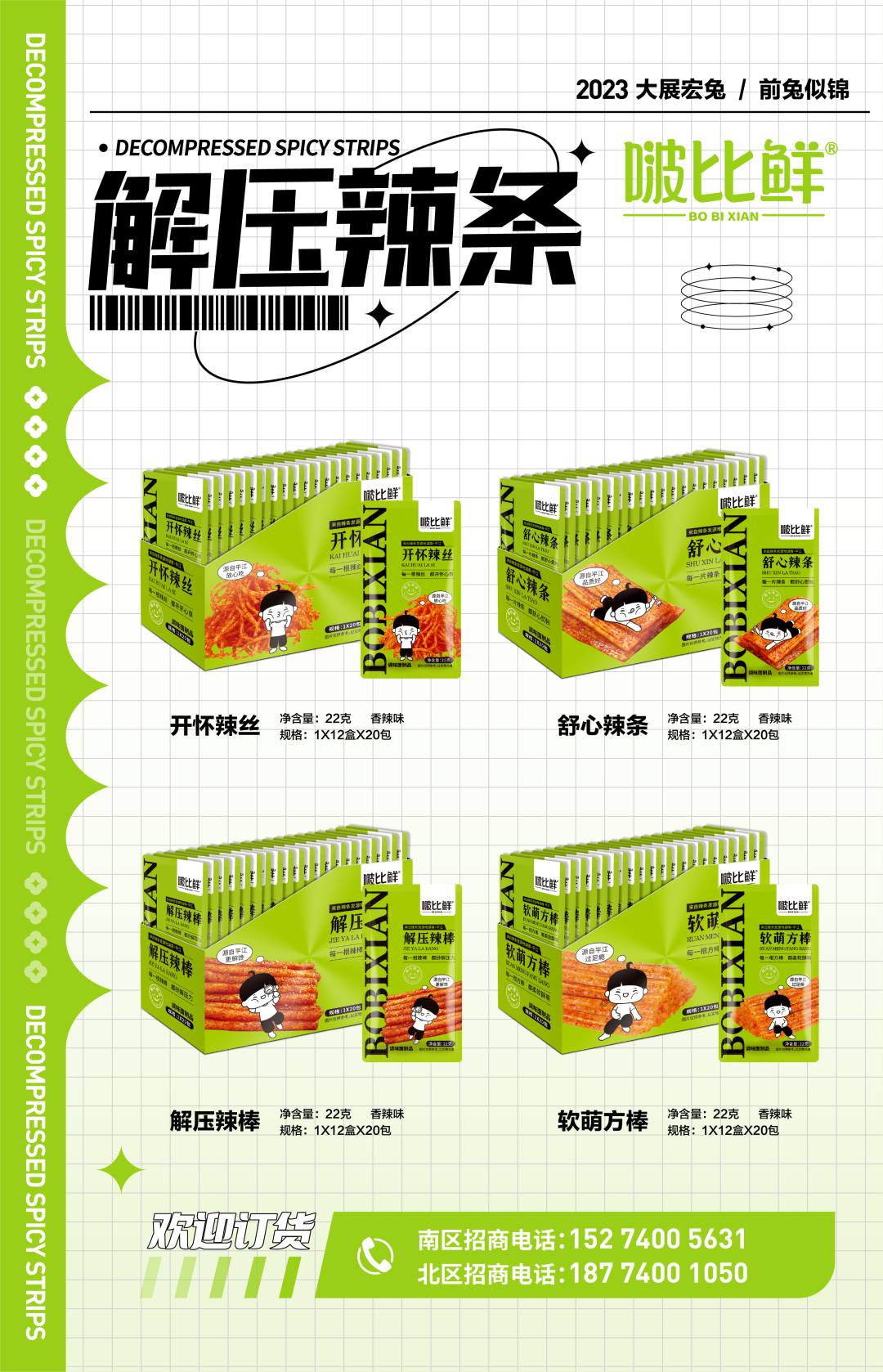 公司简介:啵比鲜“解压辣条系列”“治.愈辣条系列”“芝麻辣条系列”口味独特,包装设计理念超前,全套自动设备生产,给您带来健康的舌尖美食。