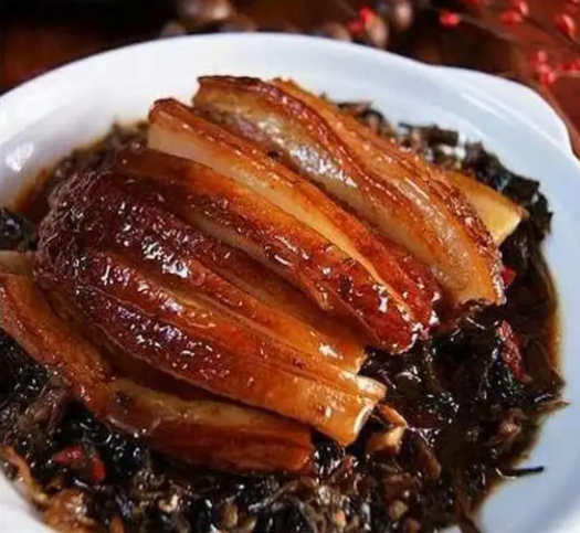 醋溜土豆丝、梅菜扣肉、葱油饼、薏仁小米粥