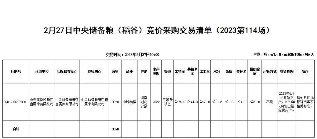 2月27日中央储备粮(稻谷)竞价采购交易会公告(2023第114场)