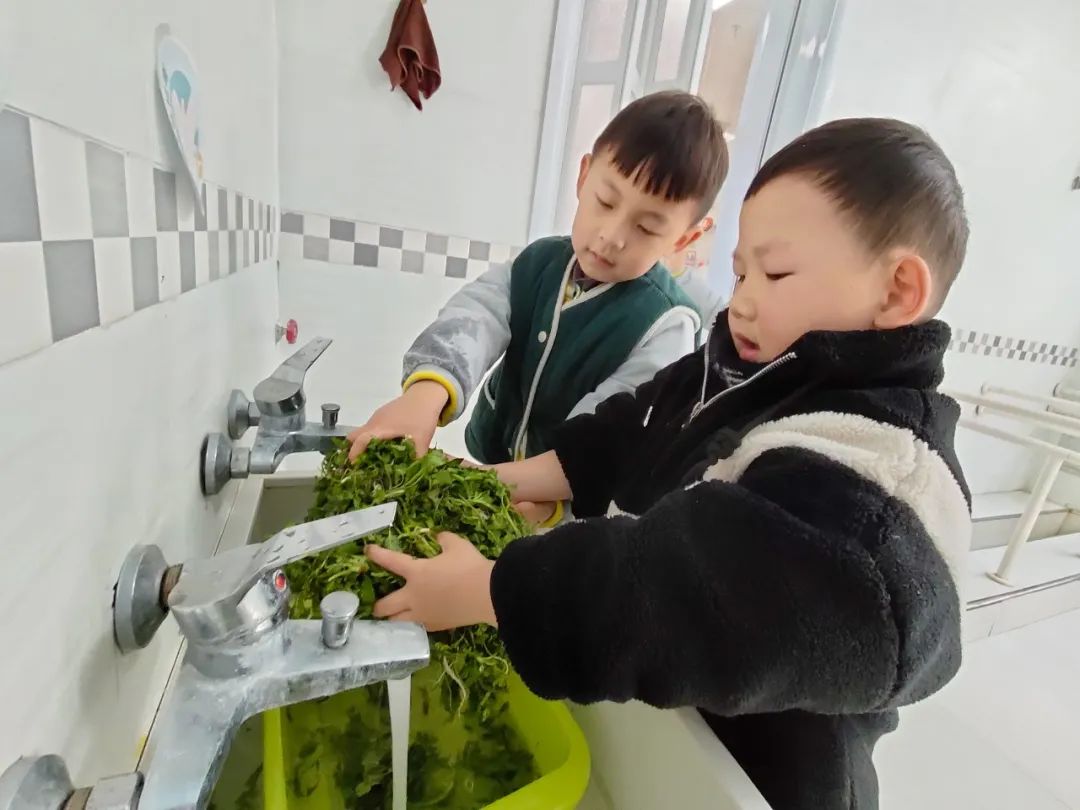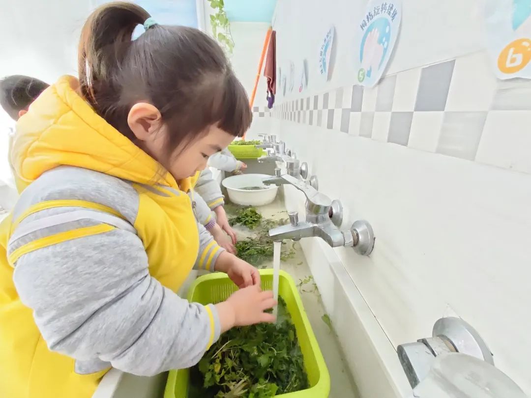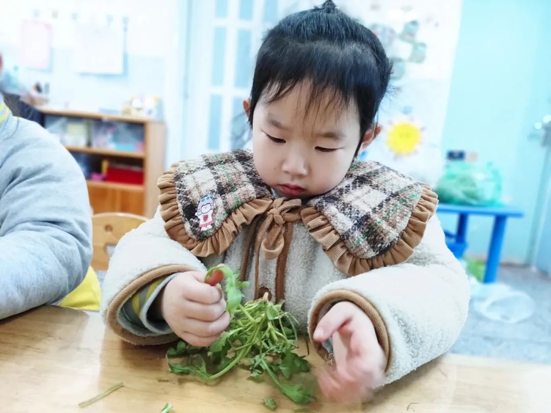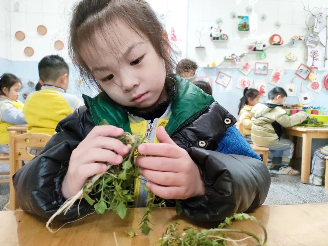 萌娃们拿起还沾有泥土的荠菜,小心地摘去它“受伤”部分,只留下可以食用的部位。