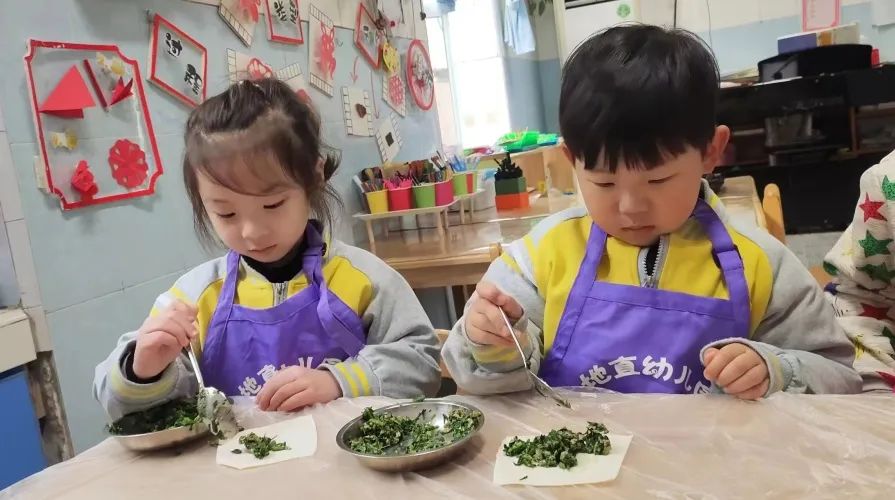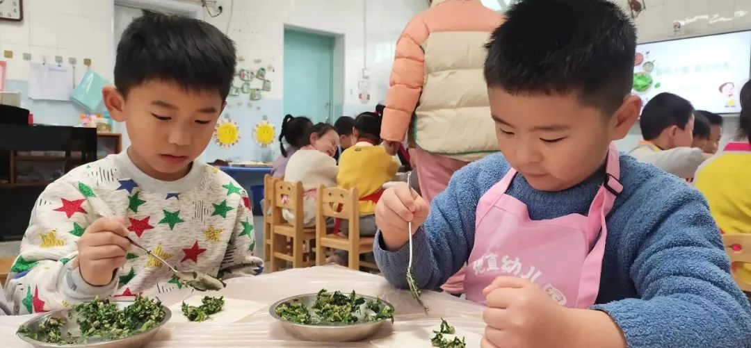 今天孩子们和刘奶奶一起制作飘着清香味道的荠菜春卷!