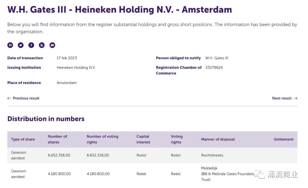 2月22日,荷兰金融市场管理局(AFM)披露,比尔·盖茨和他的基金会(Bill and Melinda Gates foundation)以8.48亿欧元的价格购买了全球第二大酿酒商喜力控股(Heineken Holding)3.76%的股份。