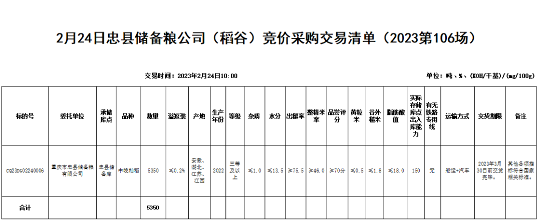 受重庆市忠县储备粮有限公司委托,重庆市粮油批发市场有限责任公司(即国家粮食重庆交易中心,以下简称“批发市场”)定于2023年2月24日10:00举办忠县储备粮公司(稻谷)竞价采购交易会,现将有关事项公告如下:2. 产地、年限及数量:安徽、湖北、江苏、江西2022年产中晚籼稻5350吨。4. 交货地点:重庆市忠县储备粮有限公司忠县储备库。5. 质量要求:一是符合国家粮食标准三等及以上质量标准,其中:出糙率≥75.5%;整精米率≥46.0%;品尝评分≥70分;黄粒米≤0.5%;水分≤13.5%(水分13.6%-13.7%之间的超0.1%扣量0.12%,超过13.7%拒收);杂质≤1.0%(杂质超标,需整理达标后入库,筛下物由卖方承担,杂质超过2.5%拒收);谷外糙米≤1.8%;品种互混率≤5.0%。二是符合稻谷储存品质判定规则(GB/T20569-2006)宜存标准,其中脂肪酸值≤18.0mgKOH/100g。三是符合食品安全标准食品中真菌毒素限量(GB2761-2017)指标,其中:黄曲霉毒素B1≤6ug/kg。四是符合国家卫生标准食品中污染物限量(GB2762-2017)指标,其中镉≤0.18mg/kg;无机砷≤0.2mg/kg。五是符合食品安全国家标准食品中农药最大残留限量(GB2763-2021)指标。六是其他各项指标必须符合国家相关标准,无虫蛀,无异味,无活虫。七是严禁掺杂以前年度陈粮。八是卖方交货时,必须向买方提供本批次粮食一个月以内的由有资质的检验机构出具的质量检验报告。6. 数量、质量验收:数量以重庆市忠县储备粮有限公司忠县储备库地磅数量为准;要求溢短装≤0.2%。质量以到库综合扦样检验为准,粮食到达交货地点后,买方(或买方指定的企业)进行初检,初检结果仅作为是否入库的初步判断依据,不作为验收时是否合格的依据。初检合格的粮食方可入库,初检不合格的粮食可拒收。标的粮食入库完毕后,整仓质量经重庆具有国家资质的专业质检机构对粮食质量进行检验,该检验结果作为买方验收依据。7. 本次交易清单附后。具体交易品种和数量等信息如有变化,以即时公告及交易清单为准。1. 报名资格:国内具有粮油生产、经营资格的企业且在国家粮食电子交易平台注册的有效会员。2. 报名时间:2023年2月24日8:00前。报名参与交易即视作全面承认并遵守《重庆市地方政府储备竞价采购交易规则》和交易公告、交易清单等要求。1. 本次竞价交易使用国家粮食交易平台地储交易系统,2023年2月24日10:00通过网络对委托标的依次按交易节进行交易。请报名参加竞价交易的会员按时登录国家粮食交易中心官网(www.grainmarket.com.cn)→点击网页上方“请登录”或右方“用户中心”进行会员登录→点击“交易”板块→选择“重庆市场”→“2月24日忠县储备粮公司(稻谷)竞价采购交易专场”。1. 保证金的收取和释放:参与竞价交易的买卖双方须交纳保证金110元/吨(其中:履约保证金100元/吨和交易保证金10元/吨)。卖方保证金须在竞价采购交易会开始前2个小时汇至批发市场指定银行账户;买方保证金须在提交委托交易清单当日汇至批发市场指定银行账户。单笔合同交割完毕后,保证金释放。如合同部分交割,该合同数量的所有保证金处于冻结状态。2. 保证金转入:汇款时请备注“保证金”,待资金到账后,进入系统“用户中心”的资金界面,点击用户名称下方的“交易账户:明细”,将足额保证金“转入”重庆市场。3. 交易手续费:按成交金额的2.0‰向卖方收取。1. 成交价格:到达重庆市忠县储备粮有限公司忠县储备库仓前交货价。2. 合同签订:自成交之日起3个工作日内买卖双方在交易系统内签订电子购销合同或以邮寄、扫描等方式签订,如逾期未签订购销合同,则对违约方作违约处理。3. 入库及付款:卖方须在2023年3月30日前交货完毕。买方须于成交之日起按进度将货款一次或分批汇入批发市场指定银行账户。当货物到达交货地点后,由重庆市忠县储备粮有限公司检验人员检斤验质。4. 结算:粮食初检合格入库后,双方按入库进度可分批签订《验收确认单》,批发市场按《验收确认单》数量在3个工作日内支付卖方90%货款。合同执行完毕并经重庆具有国家资质的专业质检机构检验合格以及收到卖方发票后,买卖双方再次签订《验收确认单》,批发市场在3个工作日内按《验收确认单》将剩余货款拨付给卖方。2. 开户银行:中国农业银行股份有限公司重庆九龙坡中梁山支行 3. 账 号:31-0707010400088881. 本场交易规则详见“重庆粮网”(www.grainmarket.com.cn/centerweb/region/CQ)、“重庆粮食集团”官网(www.cqgrain.com)《重庆市地方政府储备竞价采购交易规则》,与此规则不一致的以本次公告为准。2. 会员成交后到委托方指定交货地点交货时,需遵守当地的疫情防控政策,做好疫情防控工作。3. 各会员单位发现以陈顶新、转圈粮、套取财政补贴、人为设置障碍造成入库难等违法违规问题的,请拨打12325举报。4. 市场交易部联系电话:023-65269777 023-65269283 ▶ 网站 | www.grainmarket.com.cn/centerweb/region/CQ