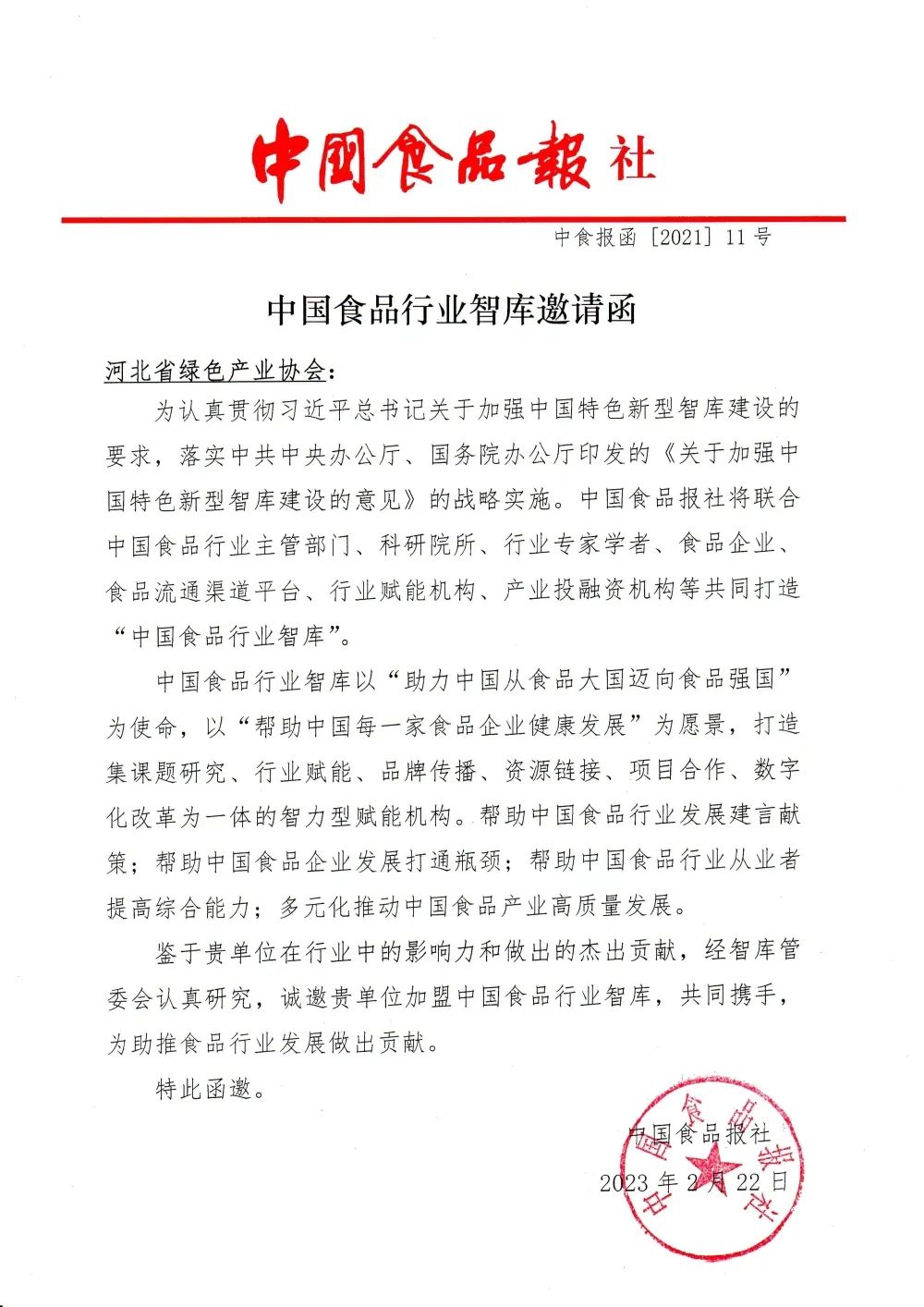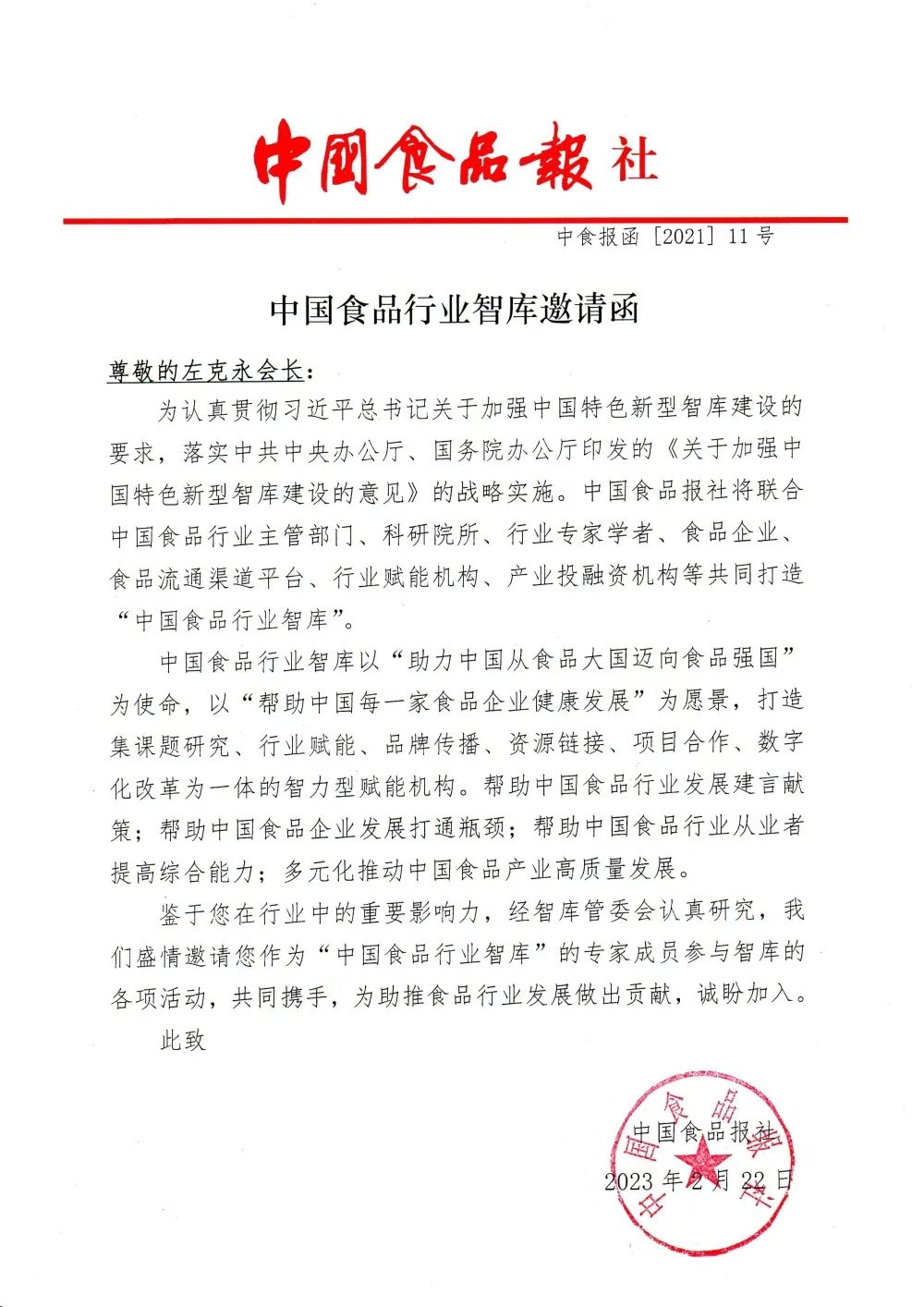 2月22日,河北省政协委员、河北省绿色产业协会会长左克永受邀加入中国食品行业智库,并作为智库专家成员进一步推动食品行业健康稳定发展。