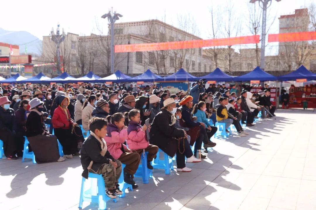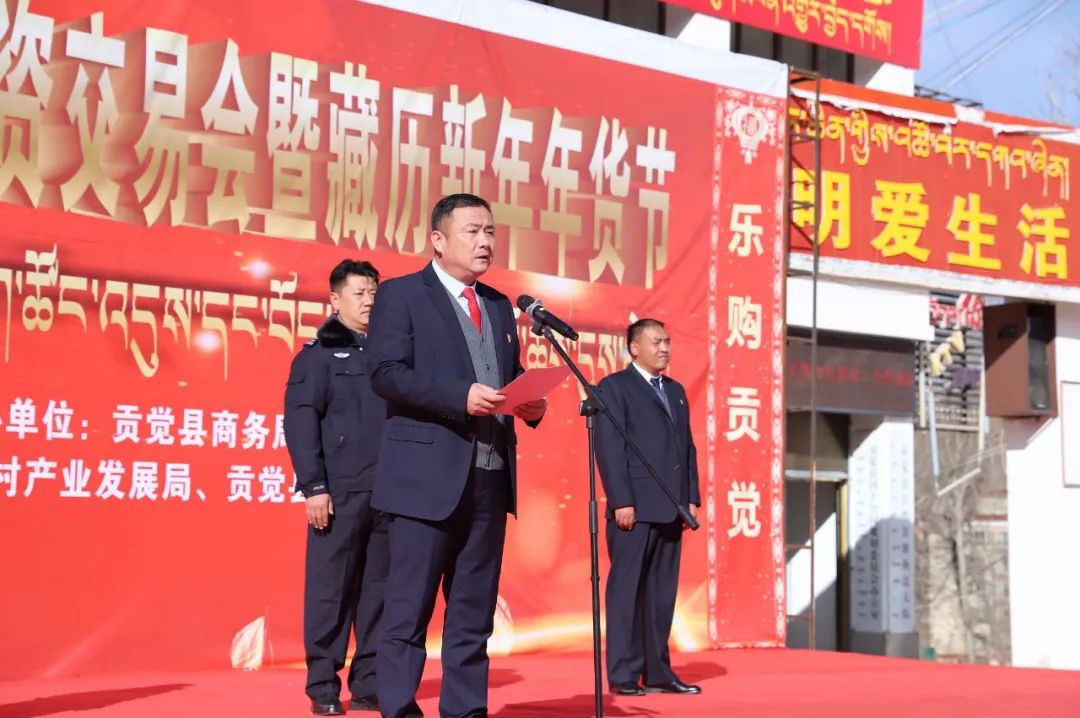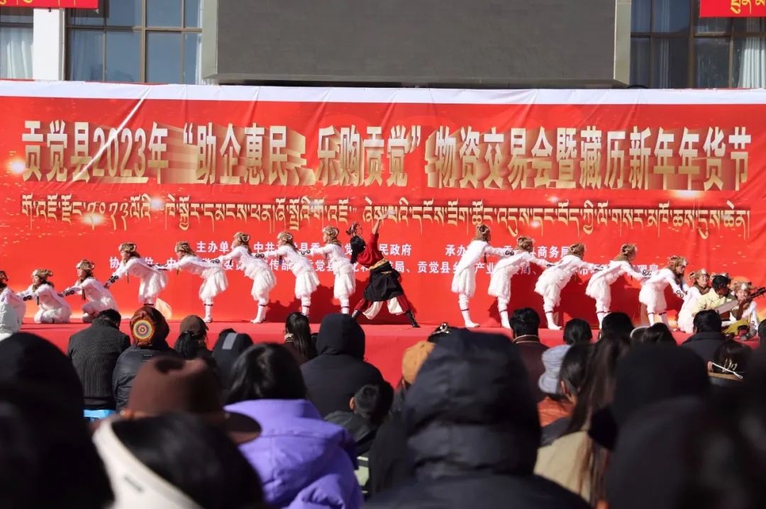 在活动现场,随风飘扬的红丝带、身穿喜庆艳丽民族服装的文艺工作者、目不暇接琳琅满目的年货商品、香味扑鼻色泽鲜美的阿旺绵羊烤肉串、此起彼伏的吆喝声嬉笑声音乐声,都为即将到来的藏历水兔新年增添了喜庆的气氛和浓浓的年味。富有贡觉特色的《牧羊人》、《情满酒歌》、《相皮锅庄》等精彩纷呈的节目轮番上演,让广大干部群众逛着热闹的交易会暨年货节,选购心仪的年货。