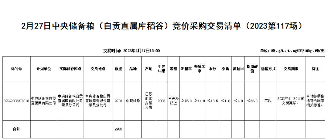 受中国储备粮管理集团有限公司成都分公司委托,重庆市粮油批发市场有限责任公司(即国家粮食重庆交易中心,以下简称“批发市场”)定于2023年2月27日15:00举办中央储备粮(自贡直属库稻谷)竞价采购交易会,现将有关事项公告如下:2. 产地、年限及数量:江苏、安徽、湖北、河南2022年产中晚籼稻2700吨。3. 交货地点:中央储备粮自贡直属库有限公司荣县分公司。5. 质量要求:一是符合稻谷国标(GB1350-2009)三等及以上质量标准,其中:出糙率≥75.0%;整精米率≥44.0%;水分≤13.5%(水分在13.6%-14.5%之间的,每超0.1%扣量0.12%,水分超过14.5%买方有权拒收);杂质≤1.0%(杂质超标需整理达标后入库,筛下物由卖方承担自行处理,杂质超2.0%买方有权拒收);黄粒米≤1.0%。二是符合稻谷储存品质判定规则(GB/T20569-2006)宜存标准,其中脂肪酸值≤22.0mgKOH/100g,色泽气味正常。三是符合食品安全标准食品中真菌毒素限量(GB2761-2017)指标。四是符合国家卫生标准食品中污染物限量(GB2762-2017)指标。五是其他各项指标必须符合国家相关标准。六是严禁掺杂陈粮及各级储备轮出粮源,严禁跨省粮源掺混发运。如有发现故意掺杂使假、转圈粮行为,买方拒收并收取违约保证金,并移交当地粮食和市场执法部门处理。6. 数量、质量验收:数量以到中央储备粮自贡直属库有限公司荣县分公司地磅数量为准。质量以到库综合扦样检验为准。粮食到达交货地点后,买方(或买方指定的存储库点企业)进行检验,对检验合格的粮食方能入库,对检验不合格的粮食可拒收。买卖双方如有质量争议,可申请有资质的第三方检测机构进行复检,由此产生的费用由过错方承担。7. 本次交易清单附后。具体交易品种和数量等信息如有变化,以即时公告及交易清单为准。1. 报名资格:国内具有粮油生产、经营资格的企业且在国家粮食电子交易平台注册的有效会员。2. 报名时间:2023年2月27日13:00前。报名参与交易即视作全面承认并遵守《中央储备粮竞价采购交易规则(试行)》和交易公告、交易清单等要求。1. 本次竞价交易使用国家粮食交易平台地储交易系统,2023年2月27日15:00通过网络对委托标的依次按交易节进行交易。请报名参加竞价交易的会员按时登录国家粮食交易中心官网(www.grainmarket.com.cn)→点击网页上方“请登录”或右方“用户中心”进行会员登录→点击“交易”板块→选择“重庆市场”→“2月27日中央储备粮(自贡直属库稻谷)竞价采购交易专场”。1. 保证金的收取和释放:参与竞价交易的会员须交纳保证金160元/吨(其中:履约保证金150元/吨和交易保证金10元/吨),于2023年2月27日13:00前到达批发市场指定银行账户,确保有足额的保证金进行交易。单笔合同交割完毕后,保证金释放。如合同部分交割,该合同数量的所有保证金处于冻结状态。2. 保证金转入:汇款时请备注“保证金”,待资金到账后,进入系统“用户中心”的资金界面,点击用户名称下方的“交易账户:明细”,将足额保证金“转入”重庆市场。3. 交易手续费:按成交金额的0.8‰向卖方收取。1. 成交价格:散粮到中央储备粮自贡直属库有限公司荣县分公司仓前交货价。2. 合同签订:自成交之日起3个工作日内买卖双方在交易系统内签订电子购销合同或以邮寄、扫描等方式签订,如逾期未签订购销合同,则对违约方作违约处理。3. 入库及付款:卖方须在2023年4月30日前交货完毕。买方须于成交之日起按进度将货款一次或分批汇入批发市场指定账户。当货物到达交货地点后,由中央储备粮自贡直属库有限公司检验人员检斤验质。4. 结算:初检合格入库后,双方按入库进度可分批签订《验收确认单》,批发市场按《验收确认单》数量在3个工作日内支付卖方90%货款。合同执行完毕收到卖方开具发票后,买卖双方签定《验收确认单》,由卖方送达批发市场,批发市场在3个工作日内按《验收确认单》将剩余货款拨付给卖方。2. 开户银行:中国农业银行股份有限公司重庆九龙坡中梁山支行 3. 账 号:31-0707010400088881. 本场交易细则详见“重庆粮网”(www.grainmarket.com.cn/centerweb/region/CQ)、“重庆粮食集团”官网(www.cqgrain.com)《中央储备粮竞价采购交易规则(试行)》,与此规则不一致的以本次公告为准。2. 会员成交后到委托方指定交货地点交货时,需遵守当地的疫情防控政策,做好疫情防控工作。3. 各会员单位发现以陈顶新、转圈粮、套取财政补贴、人为设置障碍造成入库难等违法违规问题的,请拨打12325举报。4. 市场交易部联系电话:023-65269777 023-65269283▶ 网站 | www.grainmarket.com.cn/centerweb/region/CQ