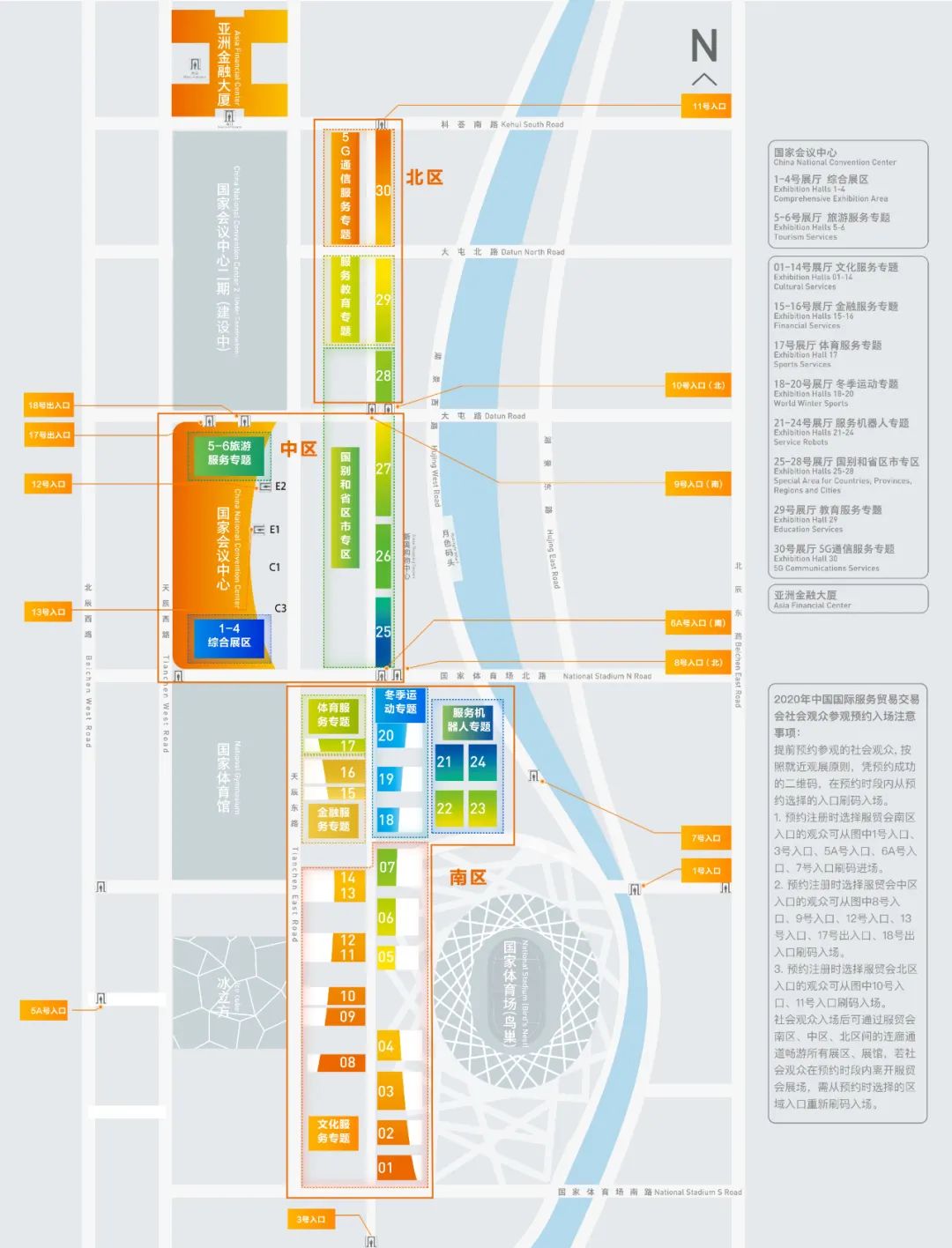个人观众进入展区后可通过南区、中区、北区间的连廊通道参观所有展区、展馆(会议区除外),若个人观众在预约时段内离开服贸会展场,须从预约的区域入口重新刷码入场,在预约时段内可多次进出展场,超出预约时间后将无法再进入展场。