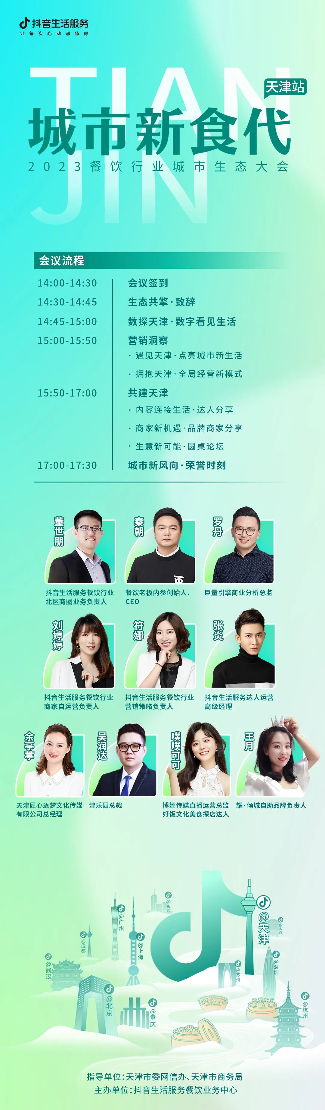 截至目前,抖音APP国内日活跃用户超过6亿。2022年,抖音生活服务餐饮行业支付GMV较2021年增长超7倍,生活服务达人数量较2021年增长163%。随着短视频、直播等内容形态不断驱动行业增长,抖音生活服务已成为餐饮经营的新阵地,助力商家品牌孵化、老品牌焕新、品牌年轻化,打造“抖”品牌。为了直观呈现天津本地生活服务发展趋势,此次大会将发布《数探天津·数字看见生活》城市报告,以图像化展示和清晰易懂的数据呈现“抖音里的天津”,洞察天津消费特色,解析城市线上繁荣度。2023年,抖音生活服务餐饮行业将全面加速业务布局与城市深耕,峰会将在全国15+重点城市巡回举办,面向餐饮行业商家、达人,服务商等,以真实、优质的内容为纽带,以专业、深度的洞察为依托,围绕创新的经营方法,持续与本地餐饮行业共探合作路径,共绘城市风味蓝图。“走进商圈探天津”,城市新食代(天津站)2023餐饮行业城市生态大会,诚邀各位共同探寻城市餐饮发展新风向。本次大会将采用"线下活动+线上直播"联动的形式进行,线下大会将于2023年2月28日14:00在天津召开。同期,峰会也将在抖音号“抖音生活服务商家助手”线上直播。登陆抖音APP,搜索#城市新食代,参与活动话题互动。八号码头、百饺园、北李妈妈菜、宾果士,众多餐饮品牌陆续参会中......