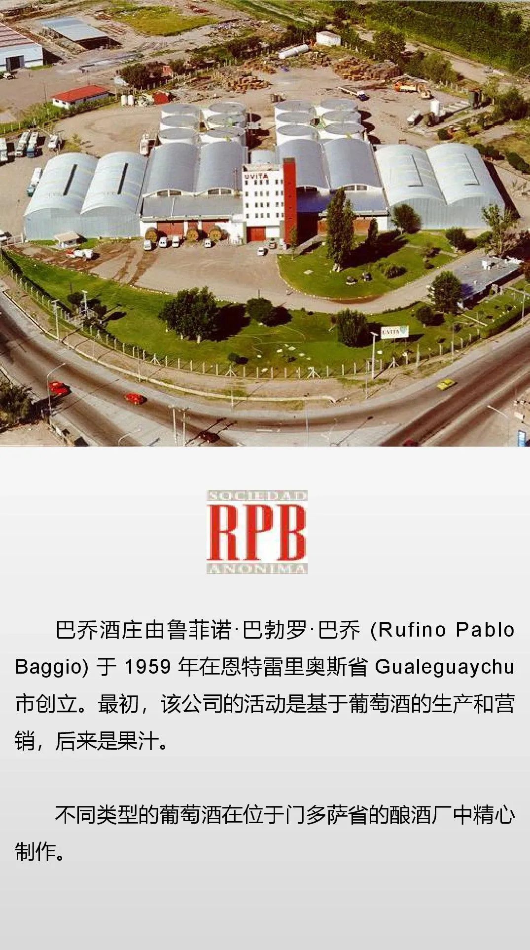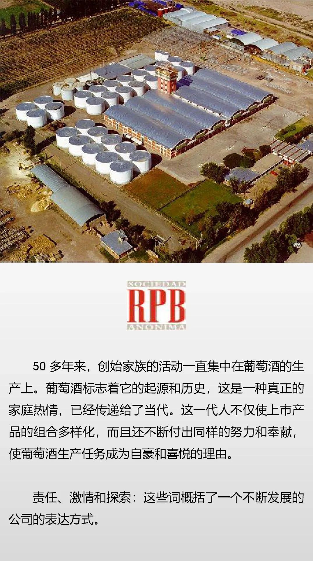 1959年,RPB公司成立于阿根廷恩特雷里奥斯省Gualeguaychu市。1983年拥有第一个属于自己的葡萄庄园Gualeguaychu。在迈普(Maipu)和门多萨(Mondoza)省的酿酒厂里酿制出适合市场需要的多种口味的葡萄酒。