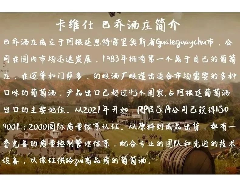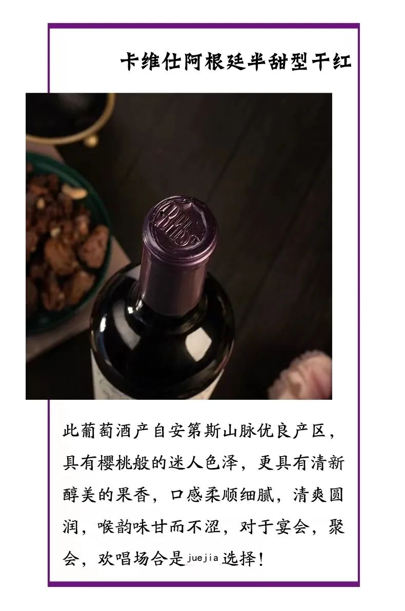 卡维仕红葡萄酒:由梅贝克、圣祖维斯、兰木斯这三种葡萄按比例均衡调制而成,梅贝克葡萄散发出的蓝莓和甘草香、圣祖维斯葡萄散发出的草莓和红醋栗香、兰木斯葡萄散发出的浆果和兰花香闻上去犹豫自身大自然再加上樱桃般的迷人色泽,令人心情愉悦,喝下去口感柔顺细腻,清爽圆润,喉韵味甘而不涩,更是令人有舒服畅快的感觉。