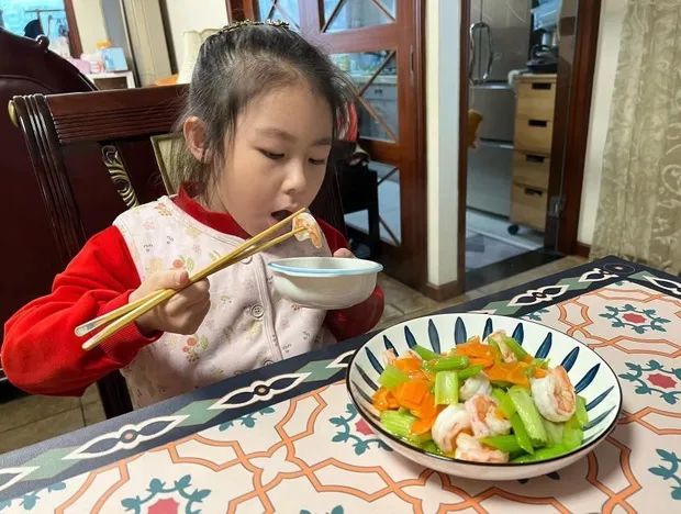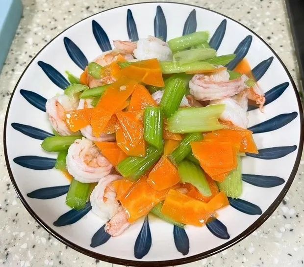 西芹富含铁元素及粗纤维,能够促进肠胃蠕动,而胡萝卜又有充足的维生素A、B1、B2等元素,两者相得益彰,加上鲜虾的Q弹口感,小朋友们都非常喜欢!