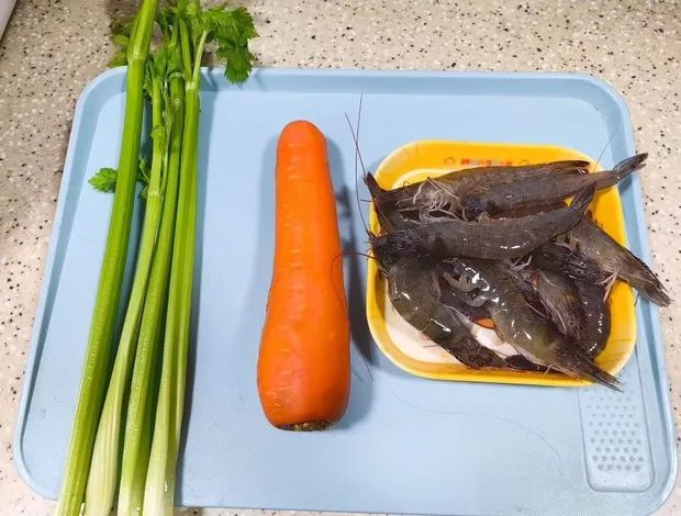 西芹两根、鲜虾10只、胡萝卜少许。
