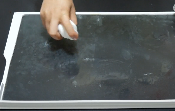 第二个妙用,清洁冰箱的隔层。我们先把冰箱隔层拆下来,再将溶液喷上去,我们用毛巾来擦拭,可以看到上面的污渍很轻松就擦干净了,效果非常的棒。