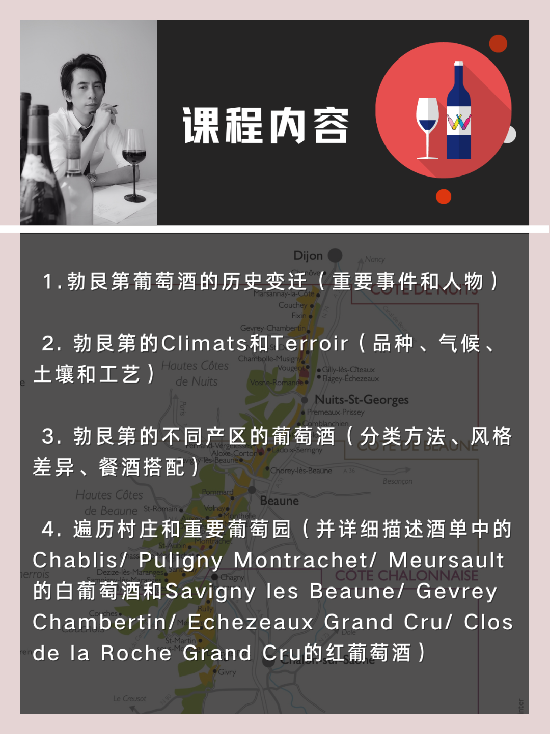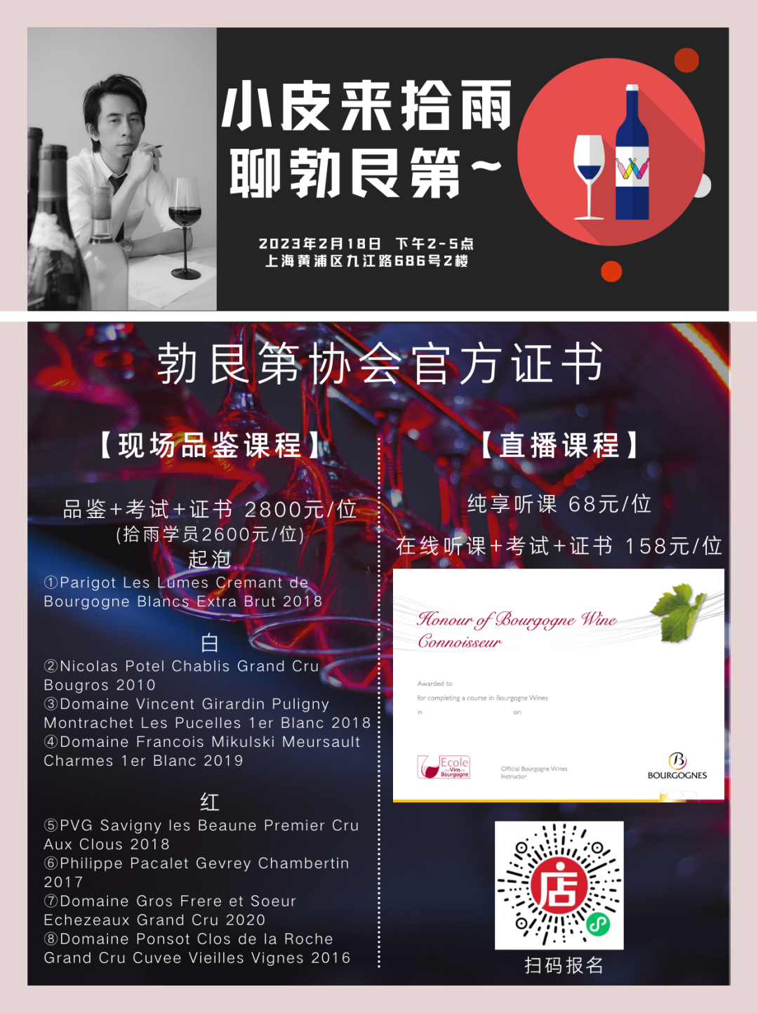 课程分现场品鉴讲解(8款高规格勃艮第总价超¥16000)和线上听课(支持在线互动),考试通过还可以获得由勃艮第葡萄酒协会颁发的纸质证书一份。
