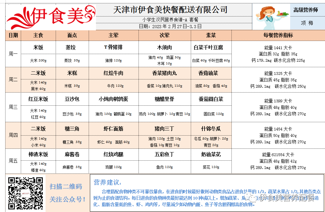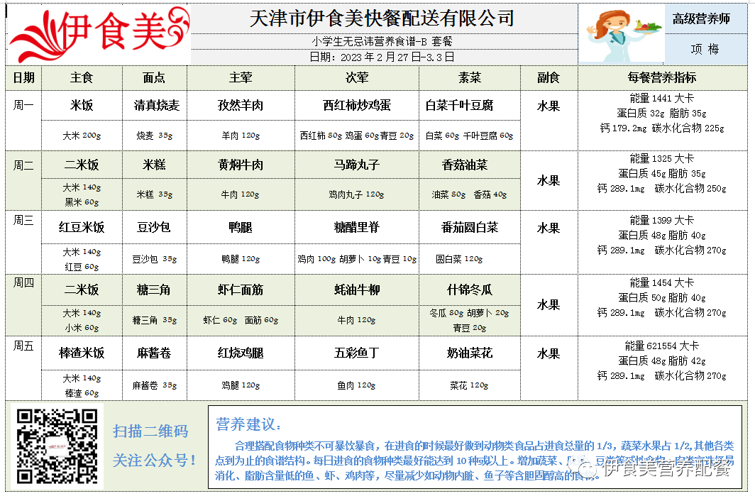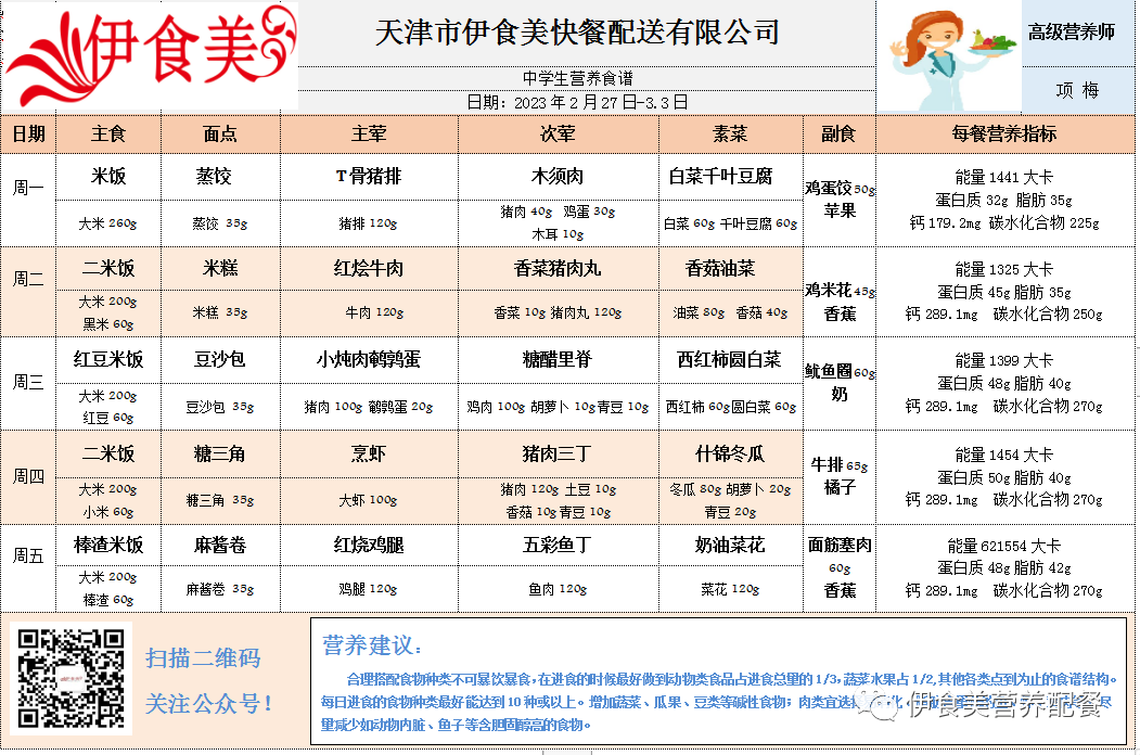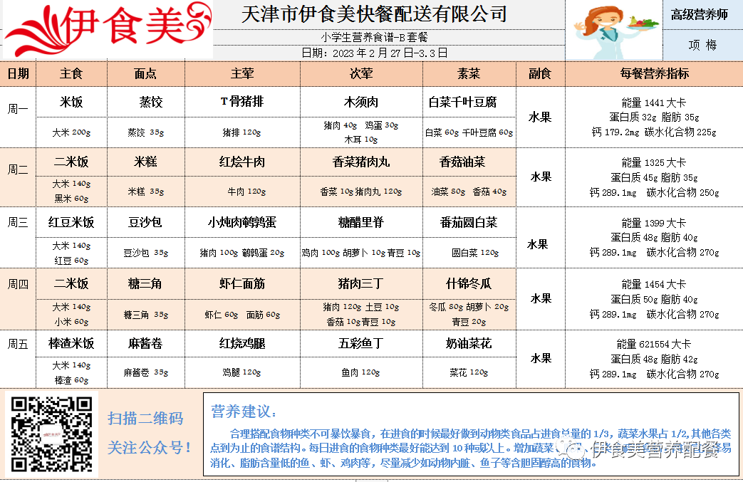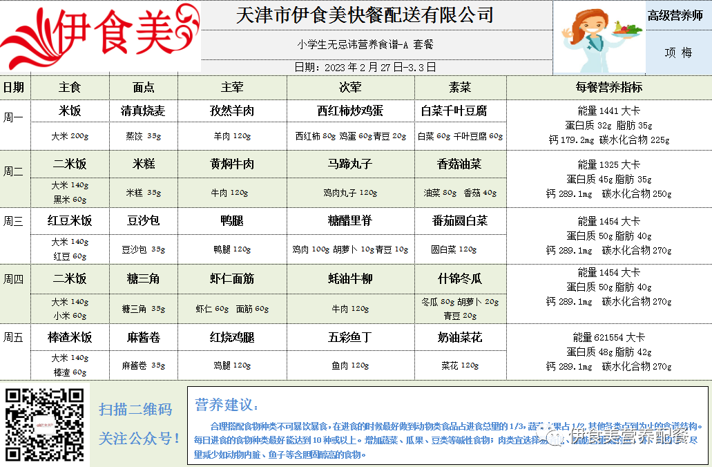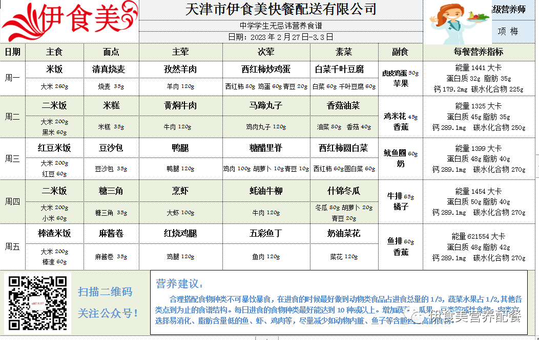 天津市伊食美快餐配送有限公司2月27日-3月3日菜谱