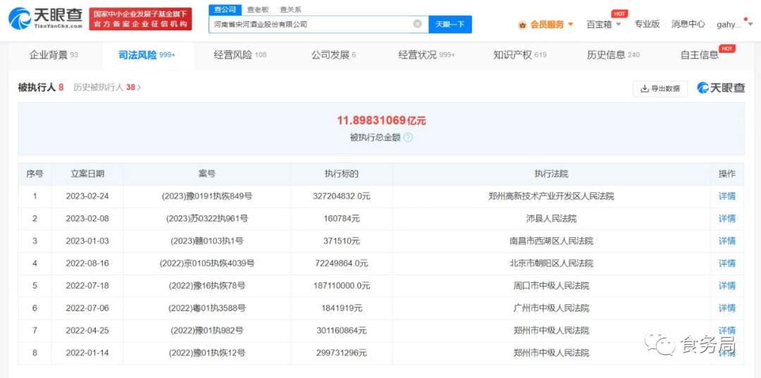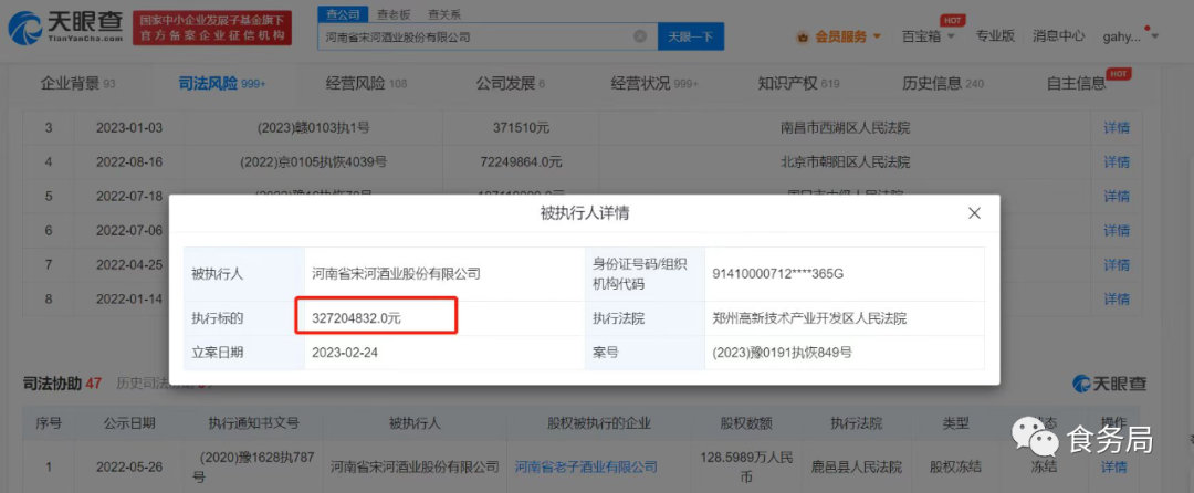 近日,知名酒企河南省宋河酒业股份有限公司新增一则恢复执行信息,执行标的3.27亿余元,执行法院为郑州高新技术产业开发区人民法院。截至目前,该公司累计被执行金额11.89亿元。
