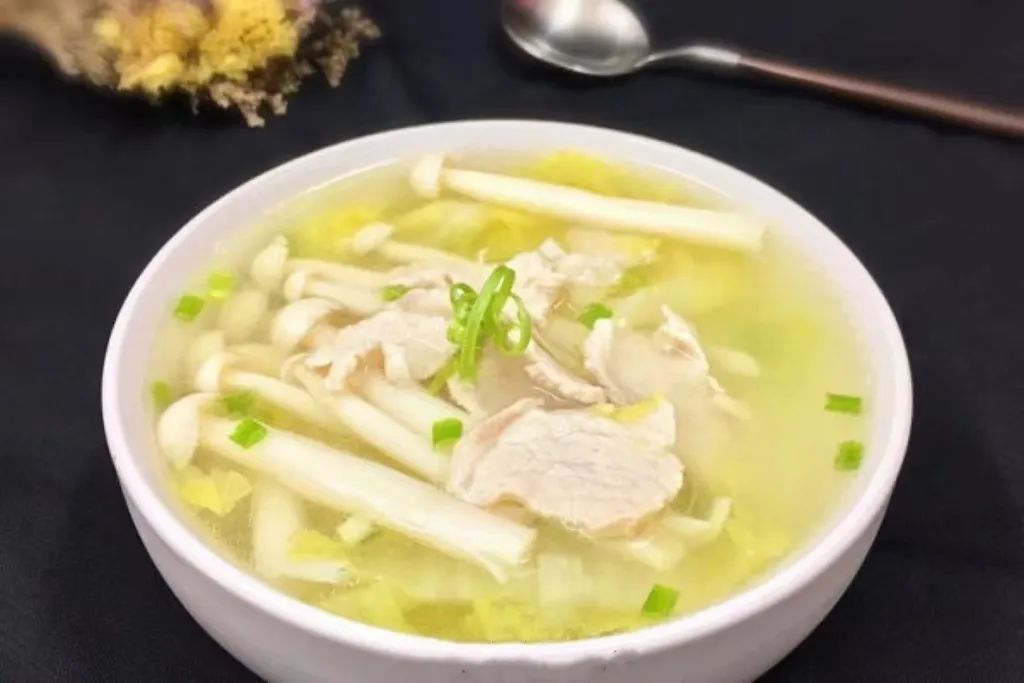 菌菇滑肉片( 鸡腿菇10克、海鲜菇15克、猪肉45克、香菇10克)