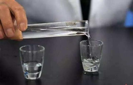 把要测的酒倒入一个透明玻璃杯中,然后滴入几滴纯净水。由于纯粮食酒中含有溶于酒,但不溶于水的高级脂肪酸乙酯,所以两者混合后会变浑浊。