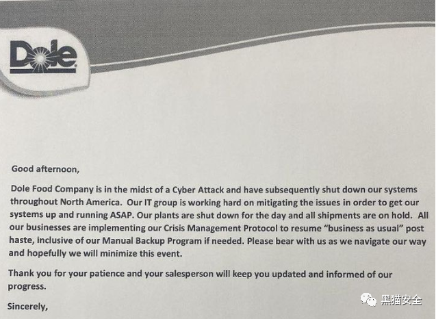 该公司没有提供攻击的细节,例如感染其系统的勒索软件家族。“Dole plc(Dole:NYSE)今天宣布,该公司最近发生了一起被认定为勒索软件的网络安全事件。”该公司发布的一则公告写道。“在得知这一事件后,多尔迅速采取行动遏制威胁,并聘请了领先的第三方网络安全专家,他们一直与多尔的内部团队合作,以解决问题并保护系统。”该公司在领先的第三方法医专家的帮助下,立即对安全漏洞展开调查,并将事件通知了有关部门。很明显,网络攻击严重扰乱了多尔的运营,导致生产工厂暂时关闭,并影响了美国杂货店的食品供应。