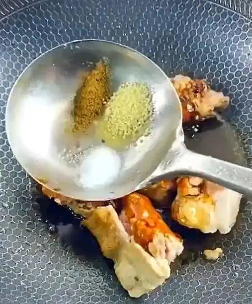 然后倒入料酒、老抽、生抽,再放入鸡精、盐、白糖、十三香
