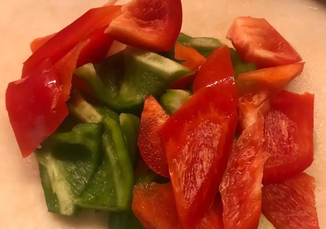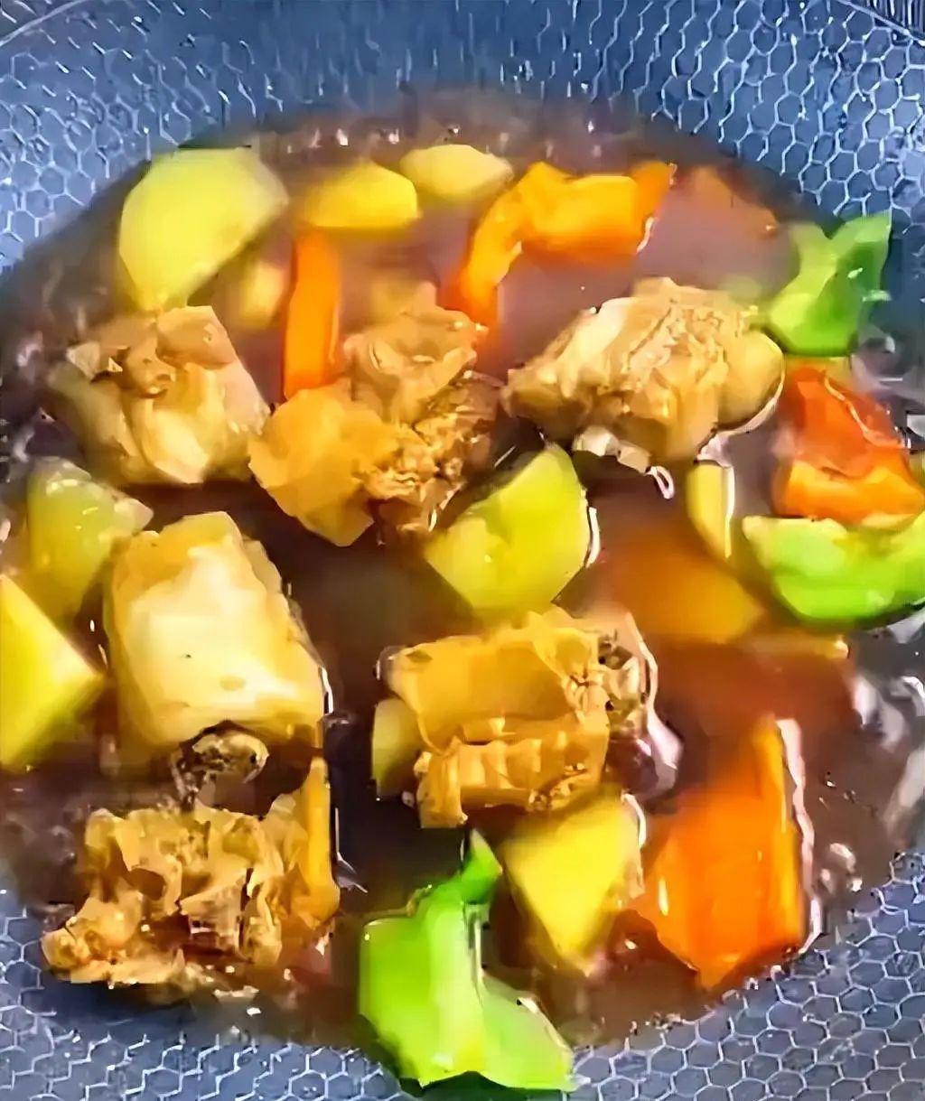 时间到,放入土豆、青红椒,再撒一点味精提鲜,再煮十分钟就可以出锅了