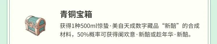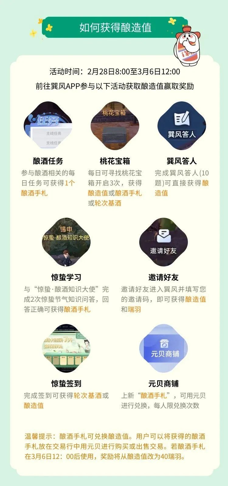 (2月28日8:00-3月6日12:00):“惊蛰·酿酒竞赛”活动,将投放“惊蛰·美自天成”数字藏品“新醅”系列合成材料,大家可通过“日常任务”、“学习酿酒知识”、开启“桃花宝箱”、完成“巽风答人”和“邀请好友”等诸多途径获取惊蛰“酿酒手札”以换取“酿造值”,酿造值排位前1000名的用户可获得合成版的“惊蛰·美自天成”(新醅500ml)数字藏品一份,及对应的荣誉称号数字藏品一份;酿造值排位前6万名的用户,根据排名获得装有不同“新醅”系列合成材料的宝箱。