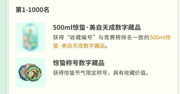 1、第1-1000名(奖励:500ml惊蛰·美自天成数字藏品和惊蛰称号数字藏品)