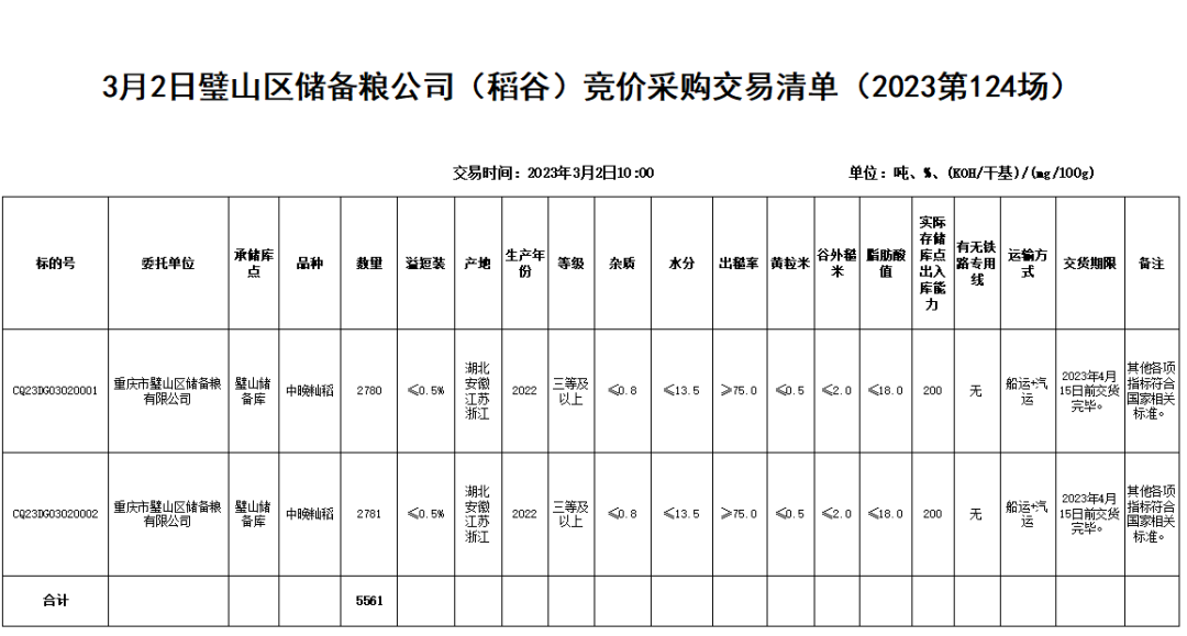受重庆市璧山区储备粮有限公司委托,重庆市粮油批发市场有限责任公司(即国家粮食重庆交易中心,以下简称“批发市场”)定于2023年3月2日10:00举办璧山区储备粮公司(稻谷)竞价采购交易会,现将有关事项公告如下:1. 标的号:CQ23DG03020001、CQ23DG03020002。2. 产地、年限及数量:湖北、安徽、江苏、浙江2022年产中晚籼稻5561吨。4. 交货地点:重庆市璧山区储备粮有限公司璧山储备库。5. 质量要求:一是符合国家粮食质量三等及以上质量标准,其中:出糙率≥75.0%;黄粒米≤0.5%;水分≤13.5%(水分在13.6%-13.8%的每超0.1%,则按本批次数量×0.12%计算扣量,超13.8%拒收),杂质≤0.8%(杂质超标需整理达标后入库,筛下物由卖方承担);谷外糙米≤2.0%;品种互混率≤5.0%。二是符合稻谷储存品质判定规则(GB/T20569-2006)宜存标准,脂肪酸值≤18.0mgKOH/100g。三是符合国家卫生标准食品中污染物限量(GB2762-2017)指标。四是符合食品安全标准食品中真菌毒素限量(GB2761-2017)指标。五是符合食品安全国家标准食品中农药最大残留限量(GB2763-2021)指标。六是其他各项指标必须符合国家相关标准,无虫蛀,无异味,无活虫。七是严禁掺杂以前年度陈粮。八是卖方交货时,必须向买方提供本批次粮食一个月以内的由有资质的检验机构出具的质量检验报告。6. 数量、质量验收:数量以重庆市璧山区储备粮有限公司璧山储备库地磅数量为准,要求溢短装≤0.5%。质量以到库综合扦样检验为准。粮食到达交货地点后,买方(或买方指定的企业)进行初检,初检结果仅作为是否入库的初步判断依据,不作为验收时是否合格的依据。初检合格的粮食方可入库,初检不合格的粮食可拒收。入库完毕后,整仓粮食质量经重庆具有国家资质的专业质检机构进行检验,该检验结果作为买方验收依据。7. 本次交易清单附后。具体交易品种和数量等信息如有变化,以即时公告及交易清单为准。1. 报名资格:国内具有粮油生产、经营资格的企业且在国家粮食电子交易平台注册的有效会员。2. 报名时间:2023年3月2日8:00前。报名参与交易即视作全面承认并遵守《重庆市地方政府储备竞价采购交易规则》和交易公告、交易清单等要求。1. 本次竞价交易使用国家粮食交易平台地储交易系统,2023年3月2日10:00通过网络对委托标的依次按交易节进行交易。请报名参加竞价交易的会员按时登录国家粮食交易中心官网(www.grainmarket.com.cn)→点击网页上方“请登录”或右方“用户中心”进行会员登录→点击“交易”板块→选择“重庆市场”→“3月2日璧山区储备粮公司(稻谷)竞价采购交易专场”。1. 保证金的收取和释放:参与竞价交易的买卖双方须交纳保证金210元/吨(其中:履约保证金200元/吨和交易保证金10元/吨)。卖方保证金须在竞价采购交易会开始前2个小时汇至批发市场指定银行账户;买方保证金须在提交委托交易清单当日汇至批发市场指定银行账户。单笔合同交割完毕后,保证金释放。如合同部分交割,该合同数量的所有保证金处于冻结状态。2. 保证金转入:汇款时请备注“保证金”,待资金到账后,进入系统“用户中心”的资金界面,点击用户名称下方的“交易账户:明细”,将足额保证金“转入”重庆市场。3. 交易手续费:按成交金额的2.0‰向卖方收取。1. 成交价格:到达重庆市璧山区储备粮有限公司璧山储备库仓前交货价。2. 合同签订:自成交之日起3个工作日内买卖双方在交易系统内签订电子购销合同或以邮寄、扫描等方式签订,如逾期未签订购销合同,则对违约方作违约处理。3. 入库及付款:卖方须在2023年4月15日前交货完毕。买方须于成交之日起按进度将货款一次或分批汇入批发市场指定银行账户。当货物到达交货地点后,由重庆市璧山区储备粮有限公司检验人员检斤验质。4. 结算:粮食初检合格入库后,双方按入库进度可分批签订《验收确认单》,批发市场按《验收确认单》数量在3个工作日内支付卖方90%货款。合同执行完毕后,整仓粮食经重庆具有国家资质的专业质检机构检验合格并收到卖方开具的足额发票后,买卖双方再次签订《验收确认单》,由卖方送达批发市场,批发市场在3个工作日内按《验收确认单》将剩余货款拨付给卖方。2. 开户银行:中国农业银行股份有限公司重庆九龙坡中梁山支行 3. 账 号:31-0707010400088881. 本场交易规则详见“重庆粮网”(www.grainmarket.com.cn/centerweb/region/CQ)、“重庆粮食集团”官网(www.cqgrain.com)《重庆市地方政府储备竞价采购交易规则》,与此规则不一致的以本次公告为准。2. 会员成交后到委托方指定交货地点交货时,需遵守当地的疫情防控政策,做好疫情防控工作。3. 各会员单位发现以陈顶新、转圈粮、套取财政补贴、人为设置障碍造成入库难等违法违规问题的,请拨打12325举报。4. 市场交易部联系电话:023-65269777 023-65269283 ▶ 网站 | www.grainmarket.com.cn/centerweb/region/CQ