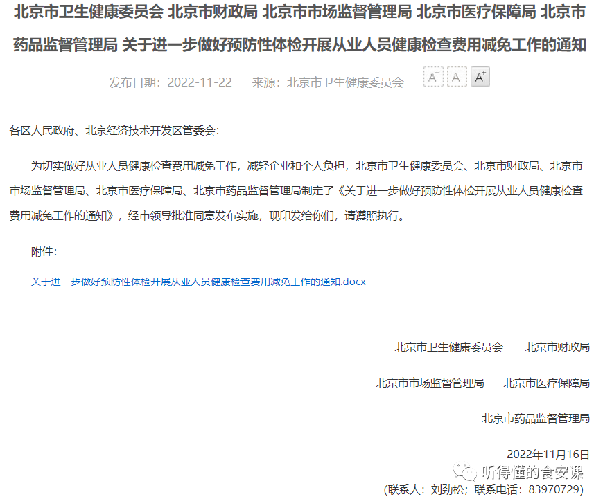 2,北京市卫生健康委员会 北京市财政局 北京市市场监督管理局 北京市医疗保障局 北京市药品监督管理局 关于进一步做好预防性体检开展从业人员健康检查费用减免工作的通知