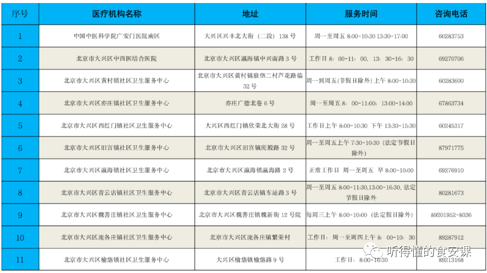1 | 北京市朝阳区太阳宫社区卫生服务中心 | 87486167、87486168 | 周一至周五:上午8:00-10:30(法定节假日除外,目前暂停诊) | 朝阳区七圣中街6号院 |