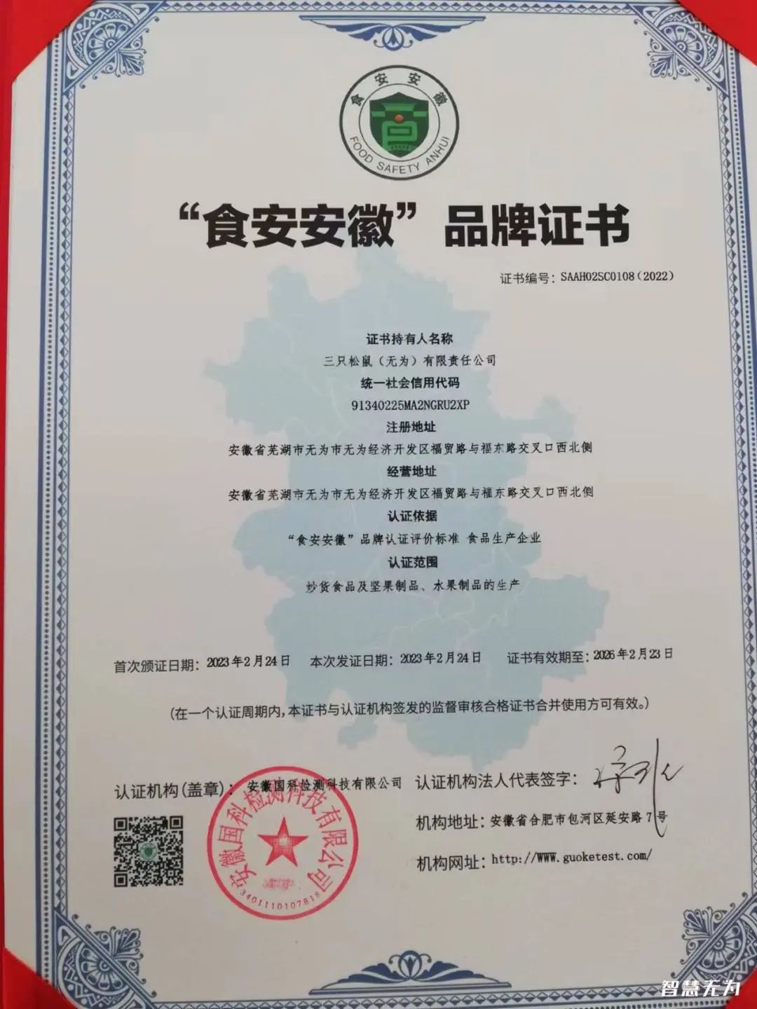 2月24日,安徽省人民政府食品安全委员会办公室发布《关于2022年度第一批“食安安徽”品牌认证评价结果的通报》(皖食安办函〔2023〕13号),经过企业申请、部门审查、专家评审、社会公示等环节,三只松鼠(无为)有限公司、安徽稼园香食品有限公司、安徽蓝田农业集团有限公司顺利通过2022年第一批“食安安徽”品牌认证评价,分别被评为“食安安徽”食品生产企业和食用农产品生产者。