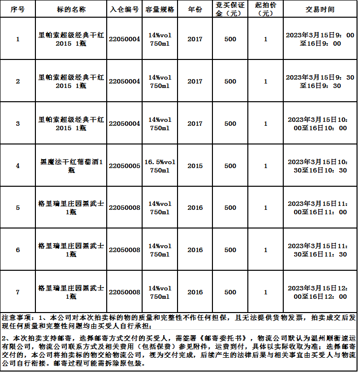 红酒展示时间、地点:2023年3月14-15日(9:00-16:00),温州国投资源回收科技有限公司展示厅(瓯海区梧田街道乐耕路159号),看样联系电话:13957771357(郑先生)