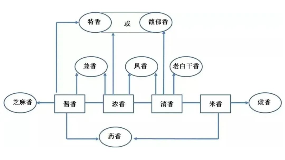 清香型白酒也称汾香型白酒,以高粱为原料酿酒,采用大麦和豌豆制曲,生产工艺可简单概括为“清蒸二次清”。典型的清香型白酒无色、清亮透明,是喜欢伏特加的外国友人比较青睐的香型。以山西杏花村汾酒为主要代表。清香型白酒酒气清香醇正,口味甘爽协调,酒味纯正绵软。酒体组成的主体是乙酸乙酯和乳酸乙酯,两者结合成为该酒主体香气,其特点是清、爽、醇、净。清香型风格基本代表了中国白干酒类的基本香型特征。兼香型白酒在香气和口感上兼顾了浓香和酱香型白酒的风味,有 2 种风格,或浓中带酱,或酱中带浓。清澈透明(微黄)、芳香、幽雅、舒适、细腻丰满、酱浓协调、余味爽净、悠长。④在浓香酒中品评,其酱味突出;在酱香型酒中品评,其浓香味突出。清亮透明(微黄)、浓香带酱香、诸味协调、口味细腻、余味爽净。以高粱为主要原料,利用麦曲进行糖化发酵,老五甑工艺酿造。其酒体无色,香气淡雅,入口后有类似芝麻的香气,伴有轻微的酱香。 清澈透明、香气清冽、醇厚回甜、尾净余香,具有芝麻香风格。1)闻香以清香加焦香的复合香气为主,类似普通白酒的陈味;2)入口后焦糊香味突出,细品有类似芝麻香气(近似焙炒芝麻的香气),有轻微的酱香;以优质高粱为原料,采用纯小麦中温曲进行发酵和老五甑工艺法酿造,其典型的感官评语有“酒体协调、微带粮香、醇厚挺拔”。
