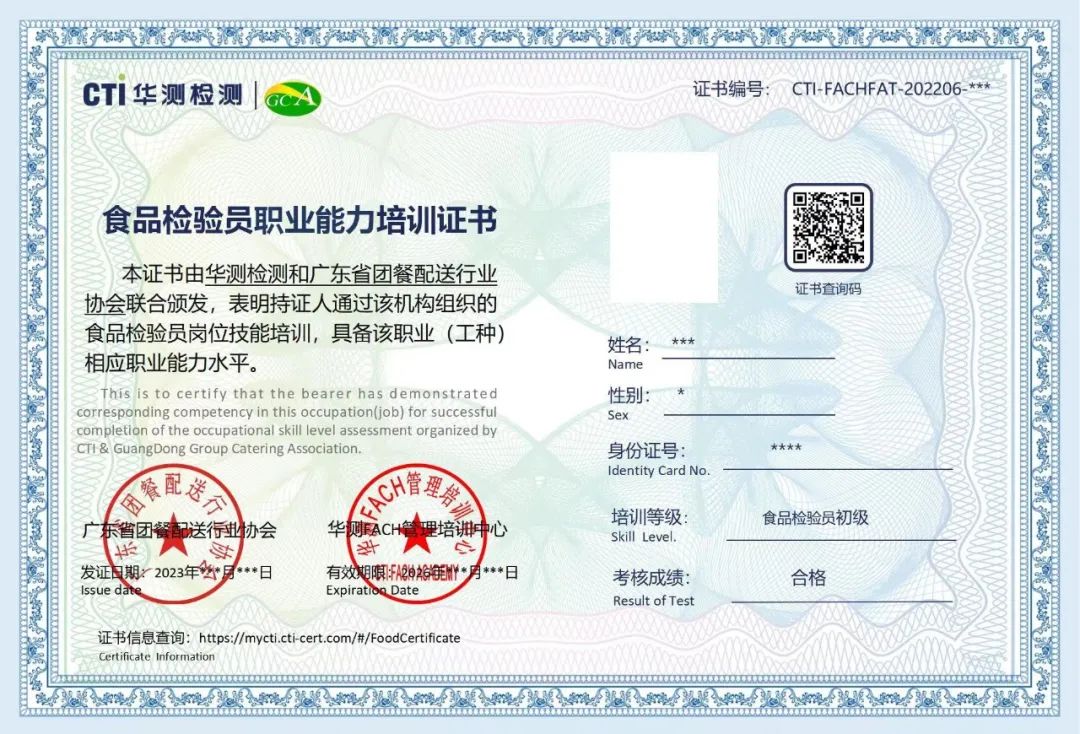 完成7小时的课程学习,并通过理论+实操考试的学员可获得由广东省团餐配送行业协会和华测 FACH 培训中心共同颁发 的餐饮业食品检验员(初级/高级)证书,证书样式如下: