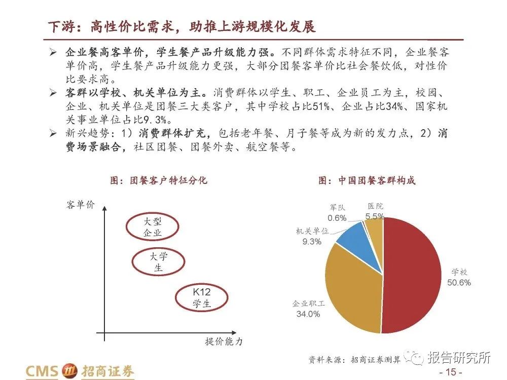 新兴趋势:1)消费群体扩充,包括老年餐、月子餐等成为新的发力点,2)消 费场景融合,社区团餐、团餐外卖、航空餐等。