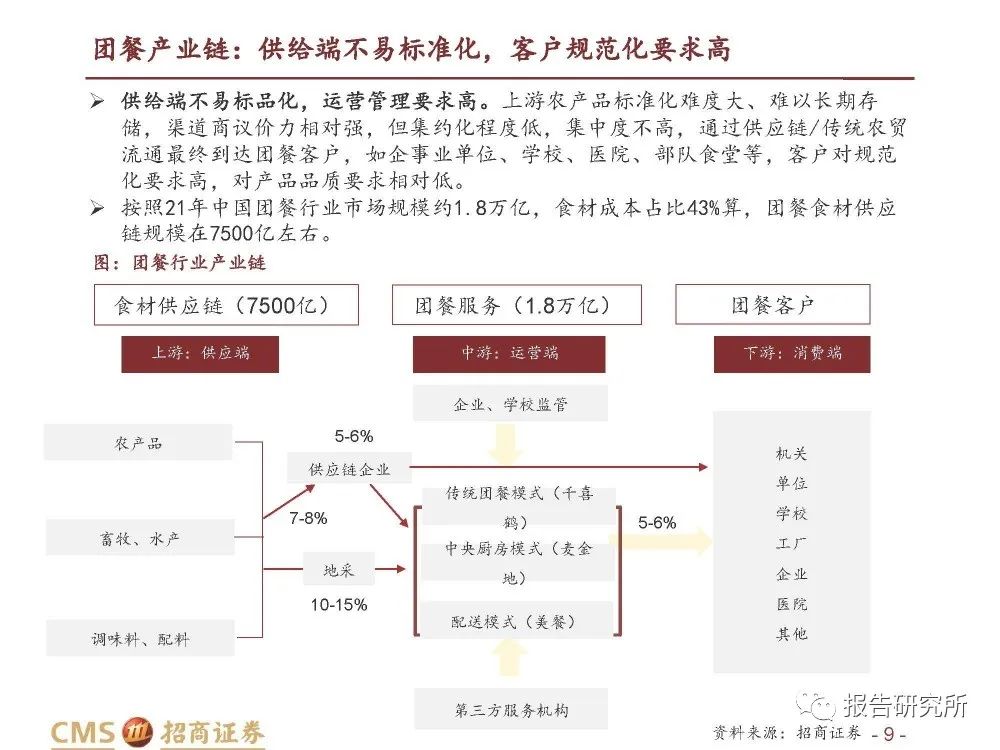 供给端不易标品化,运营管理要求高。上游农产品标准化难度大、难以长期存 储,渠道商议价力相对强,但集约化程度低,集中度不高,通过供应链/传统农贸 流通最终到达团餐客户,如企事业单位、学校、医院、部队食堂等,客户对规范 化要求高,对产品品质要求相对低。