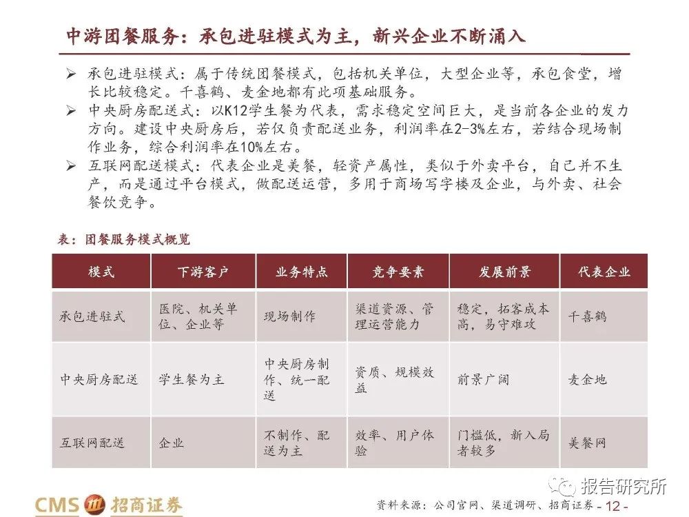 市场化团餐:更接近社会餐饮,互联网基因新入局者如美餐主要布局在这一板块, 没有生产能力,配送为主。传统企业麦金地、千喜鹤也有在做,盈利水平因企业 情况而异,最近两年互联网企业盈利有所下降。