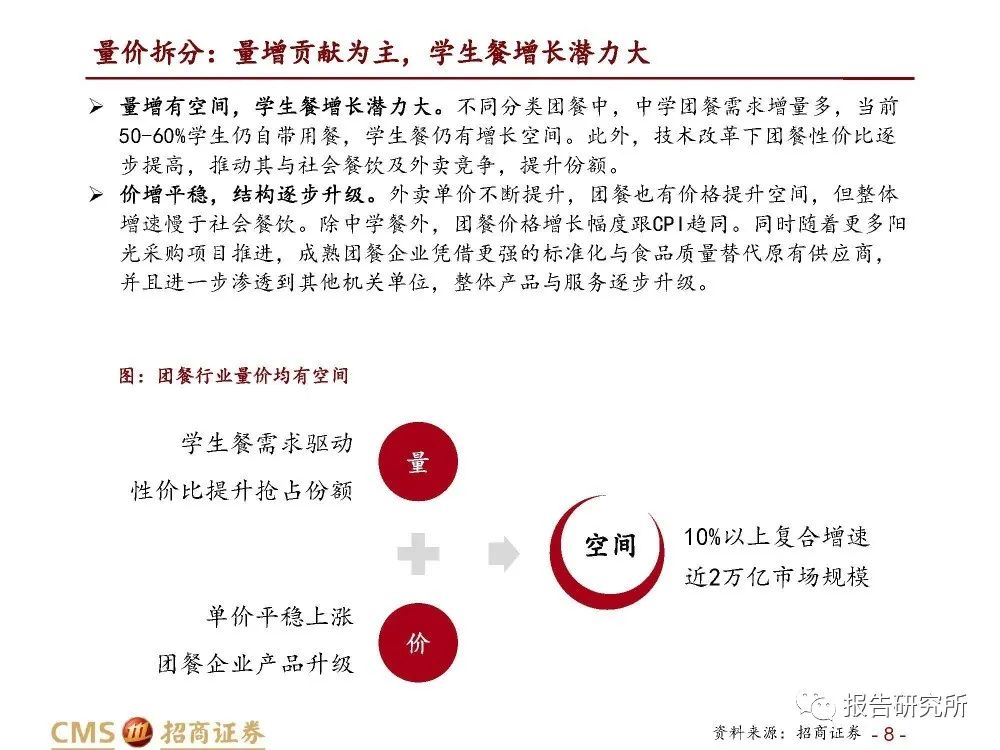 量价拆分:量增贡献为主,学生餐增长潜力大