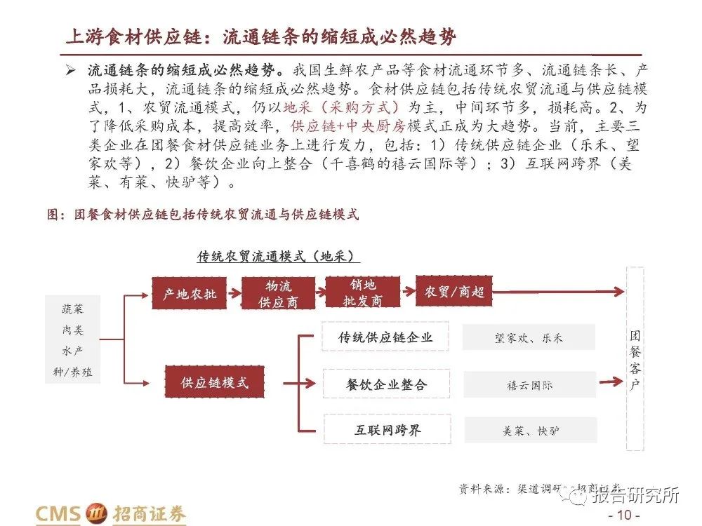 流通链条的缩短成必然趋势。我国生鲜农产品等食材流通环节多、流通链条长、产 品损耗大,流通链条的缩短成必然趋势。食材供应链包括传统农贸流通与供应链模 式,1、农贸流通模式,仍以地采(采购方式)为主,中间环节多,损耗高。2、为 了降低采购成本,提高效率,供应链+中央厨房模式正成为大趋势。当前,主要三 类企业在团餐食材供应链业务上进行发力,包括:1)传统供应链企业(乐禾、望 家欢等),2)餐饮企业向上整合(千喜鹤的禧云国际等);3)互联网跨界(美 菜、有菜、快驴等)。
