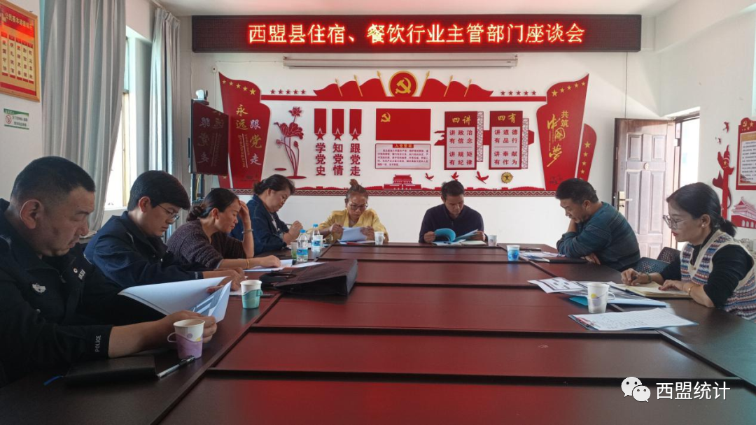 为做好我县住宿、餐饮业行业相关工作,2月24日上午,西盟县统计局召开住宿、餐饮行业主管部门座谈会,会议由县统计局贸易业分管领导主持,县公安局、县文化和旅游局、县市场监督管理局分管领导及业务人员参加。会上,县统计局分管领导通报目前西盟县住宿、餐饮业面临的问题及安排部署2023年住宿、餐饮业工作。县统计局业务人员对住宿、餐饮两个行业的重点经济指标做了详细解读,对两个行业的企业存在的经营问题、一季度经济预判及1-2月的监测情况做了分析。