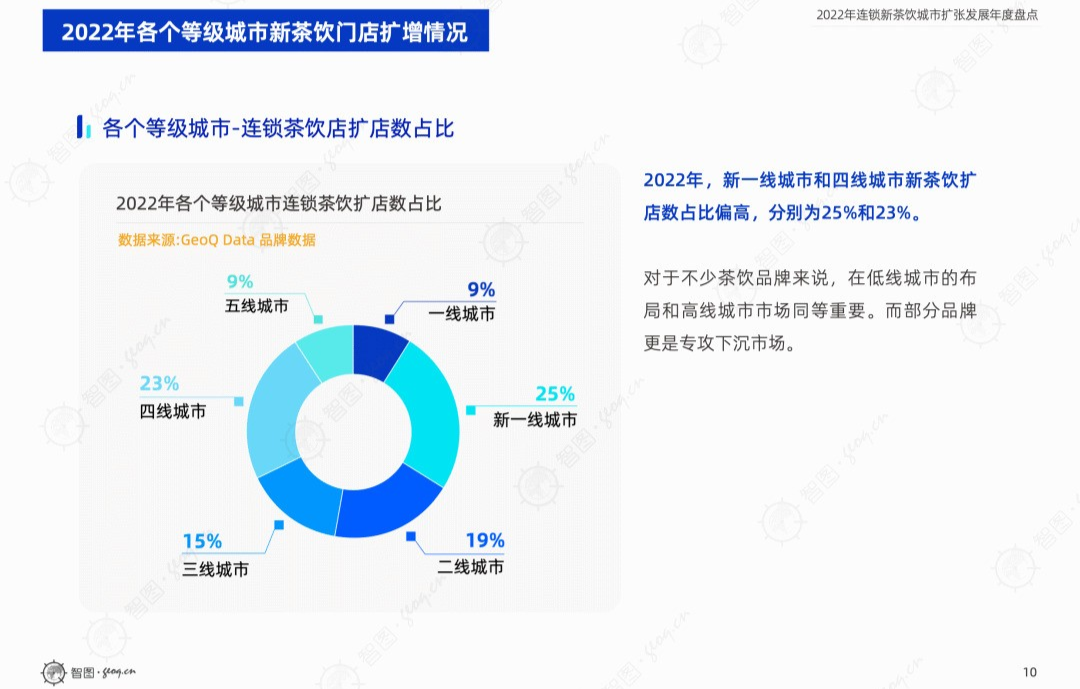 作为下沉市场中盈利最多的蜜雪冰城,其依靠加盟的模式盈利已经破百亿元大关。喜茶也在2022年,放弃坚持了十年的直营模式,开放了加盟模式。这都说明了一二线城市的茶饮市场逐渐趋于饱和,茶饮品牌开始转移目标,向着三四线城市开拓。