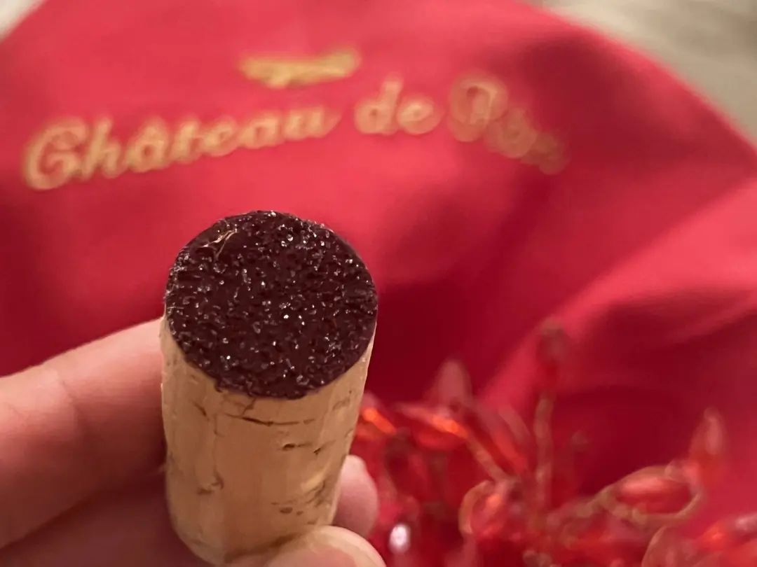原来是开瓶后发现酒塞上有一层亮闪闪,好像钻石一样的晶体。小小的软木塞,被红葡萄酒染上紫红色,在灯光下闪闪发光,好似微型的红宝石矿山,漂亮极了。