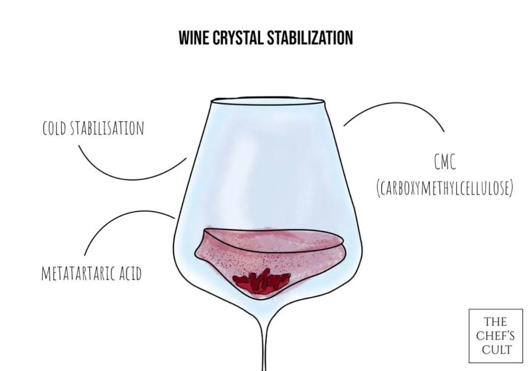 在葡萄酒发酵完后,装瓶前,有一步工序叫做“酒石酸稳定”,也就是将葡萄酒进行冷却处理,形成酒石酸结晶,过滤剔除掉。价格相对便宜的大批量酒都会进行这一步骤,使葡萄酒外观清澈讨喜,口味简单易饮,更容易被大众所接受。
