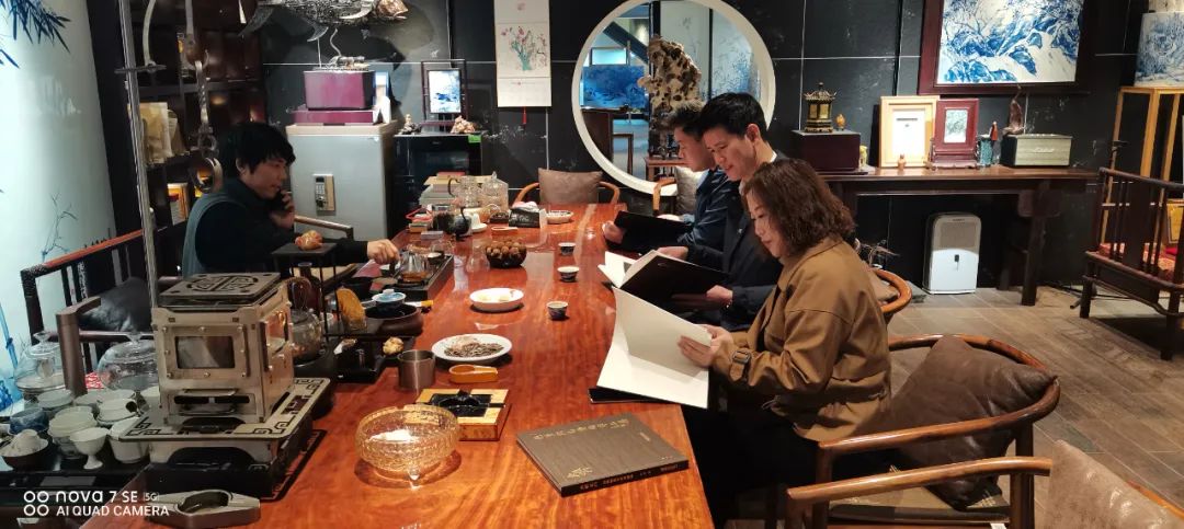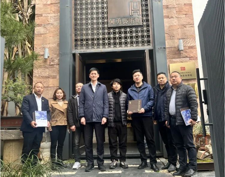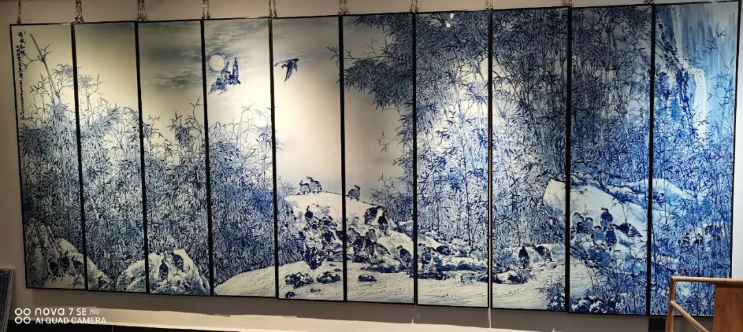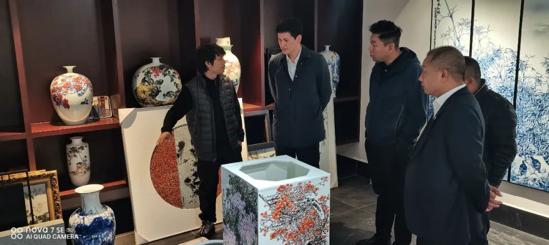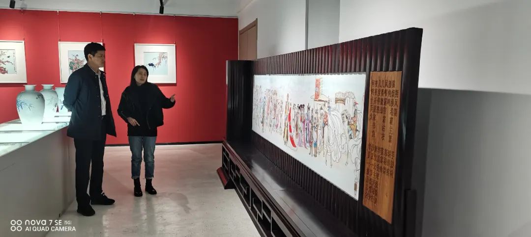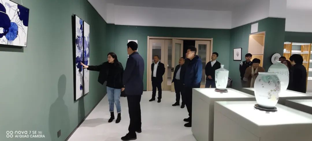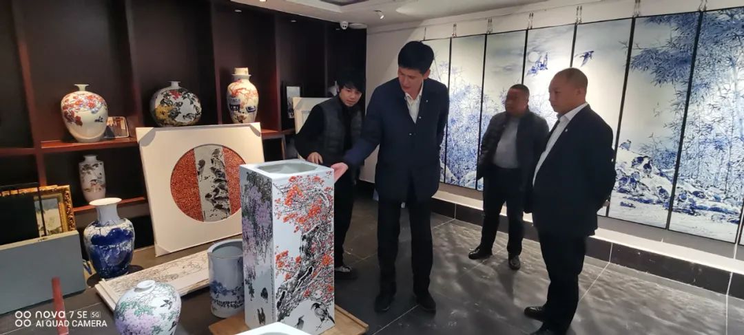 随后朱明董事长一行来到何勇艺术馆,琳琅满目的青花瓷板画让大家看的目不转睛,不禁感叹中国陶瓷的诱人魅力。在传统青花工艺的基础上,何勇结合现代陶瓷工艺特点,通过国画水墨表现手法创新开拓宽了青花泼彩,由于泼墨的偶然性,百件作品无一复制,件件皆孤品。