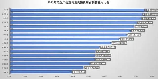 2021年,16家白酒上市公司的公开数据显示,总共支出广告宣传及促销费用210.93亿元,占总销售费用的69.15%,其中浓香型阵营的五粮液广告宣传及促销费用为50.05亿元,泸州老窖为29.08亿元,古井贡酒为21.69亿元,洋河股份为19.12亿元;而酱香型阵营的茅台,广告宣传及促销费用为23.63亿元;清香型咱们就不算了。