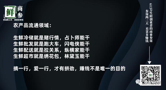想开门店的食配老板要清楚,批发是高速路,配送是国道,超市是景区小路,转型做农产品食材零售的企业一定要依据自身的经营策略和经营技术来谨慎选择进入零售门店的红海市场