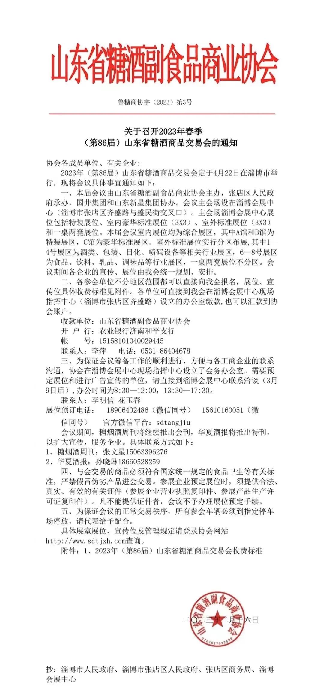 近日,山东省糖酒副食品商业协会发布公告:2023年春季(第86届)山东省糖酒商品交易会,定于4月22日在淄博会展中心举办。本届会议由山东省糖酒副食品商业协会主办,淄博市张店区人民政府承办,国井集团和山东新星集团协办。