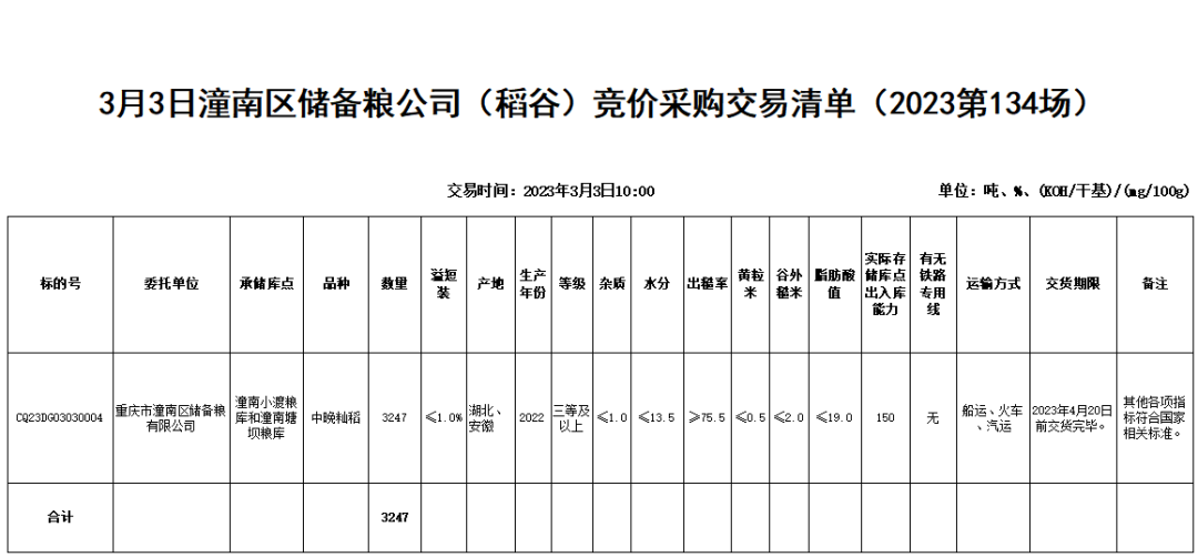 受重庆市潼南区储备粮有限公司委托,重庆市粮油批发市场有限责任公司(即国家粮食重庆交易中心,以下简称“批发市场”)定于2023年3月3日10:00举办潼南区储备粮公司(稻谷)竞价采购交易会,现将有关事项公告如下:2. 产地、年限及数量:湖北、安徽2022年产中晚籼稻3247吨。5. 质量要求:一是符合国家粮食质量三等及以上质量标准,其中:出糙率≥75.5%;黄粒米≤0.5%;水分≤13.5%(水分在13.6%-14.0%的每超0.1%,则按本批次数量×0.12%计算扣量,超14.0%买方有权拒收);杂质≤1.0%(杂质超标需整理达标后入库,整理损耗由卖方承担,超2.0%买方有权拒收);谷外糙米≤2.0%;品种互混率≤5.0%。二是符合稻谷储存品质判定规则(GB/T20569-2006)宜存标准,其中脂肪酸值≤19.0mgKOH/100g。三是符合食品安全标准食品中真菌毒素限量(GB2761-2017)指标,其中黄曲霉毒素B1≤6.0ug/kg。四是符合国家卫生标准食品中污染物限量(GB2762-2017)指标,其中镉≤0.16mg/kg;无机砷≤0.2mg/kg。五是符合食品安全国家标准食品中农药最大残留限量(GB2763-2021)指标。六是其他各项指标必须符合国家相关标准,无虫蛀,无异味,无活虫。七是严禁掺杂以前年度陈粮。八是卖方交货时,必须向买方提供本批次粮食一个月以内的由有资质的检验机构出具的质量检验报告。6. 数量、质量验收:数量以重庆市潼南区储备粮有限公司潼南小渡粮库或塘坝粮库地磅数量为准;要求溢短装≤1.0%。质量以到库综合扦样检验为准;粮食到达交货地点后,买方(或买方指定的企业)进行初检,初检结果仅作为是否入库的初步判断依据,不作为验收时是否合格的依据。初检合格的粮食方可入库,初检不合格的粮食可拒收。入库完毕后,整仓粮食质量经重庆具有国家资质的专业质检机构进行检验,该检验结果作为买方验收依据。7. 本次交易清单附后。具体交易品种和数量等信息如有变化,以即时公告及交易清单为准。1. 报名资格:国内具有粮油生产、经营资格的企业且在国家粮食电子交易平台注册的有效会员。2. 报名时间:2023年3月3日8:00前。报名参与交易即视作全面承认并遵守《重庆市地方政府储备竞价采购交易规则》和交易公告、交易清单等要求。1. 本次竞价交易使用国家粮食交易平台地储交易系统,2023年3月3日10:00通过网络对委托标的依次按交易节进行交易。请报名参加竞价交易的会员按时登录国家粮食交易中心官网(www.grainmarket.com.cn)→点击网页上方“请登录”或右方“用户中心”进行会员登录→点击“交易”板块→选择“重庆市场”→“3月3日潼南区储备粮公司(稻谷)竞价采购交易专场”。1. 保证金的收取和释放:参与竞价交易的买卖双方须交纳保证金210元/吨(其中:履约保证金200元/吨和交易保证金10元/吨)。卖方保证金须在竞价采购交易会开始前2个小时汇至批发市场指定银行账户;买方保证金须在提交委托交易清单当日汇至批发市场指定银行账户。单笔合同交割完毕后,保证金释放。如合同部分交割,该合同数量的所有保证金处于冻结状态。2. 保证金转入:汇款时请备注“保证金”,待资金到账后,进入系统“用户中心”的资金界面,点击用户名称下方的“交易账户:明细”,将足额保证金“转入”重庆市场。3. 交易手续费:按成交金额的2.0‰向卖方收取。1. 成交价格:到达重庆市潼南区储备粮有限公司潼南小渡粮库和塘坝粮库仓前交货价。2. 合同签订:自成交之日起3个工作日内买卖双方在交易系统内签订电子购销合同或以邮寄、扫描等方式签订,如逾期未签订购销合同,则对违约方作违约处理。3. 入库及付款:卖方须在2023年4月20日前交货完毕。买方须于成交之日起按进度将货款一次或分批汇入批发市场指定银行账户。当货物到达交货地点后,由重庆市潼南区储备粮有限公司检验人员检斤验质。4. 结算:粮食初检合格入库后,双方按入库进度可分批签订《验收确认单》,批发市场按《验收确认单》数量在3个工作日内支付卖方90%货款。合同执行完毕后,整仓粮食质量经重庆具有国家资质的专业质检机构检验合格并收到卖方开具的足额发票后,买卖双方再次签订《验收确认单》,由卖方送达批发市场,批发市场在3个工作日内按《验收确认单》将剩余货款拨付给卖方。2. 开户银行:中国农业银行股份有限公司重庆九龙坡中梁山支行 3. 账 号:31-0707010400088881. 本场交易规则详见“重庆粮网”(www.grainmarket.com.cn/centerweb/region/CQ)、“重庆粮食集团”官网(www.cqgrain.com)《重庆市地方政府储备竞价采购交易规则》,与此规则不一致的以本次公告为准。2. 会员成交后到委托方指定交货地点交货时,需遵守当地的疫情防控政策,做好疫情防控工作。3. 各会员单位发现以陈顶新、转圈粮、套取财政补贴、人为设置障碍造成入库难等违法违规问题的,请拨打12325举报。4. 市场交易部联系电话:023-65269777 023-65269283